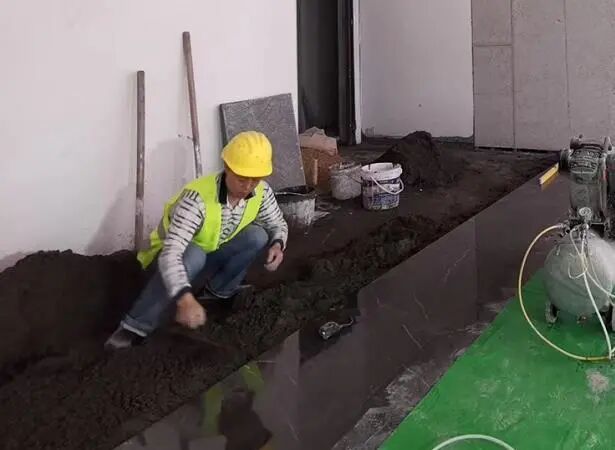 运用材料:水泥、沙(1:3干湿性砂浆)结构要点:大理石板底使用1:3干湿性砂浆粘接原有混凝土层安装完成后原水泥地面层到大理石完成面≥50mm适用于地面、楼梯的石材铺贴水泥砂浆调配大理石地面安装