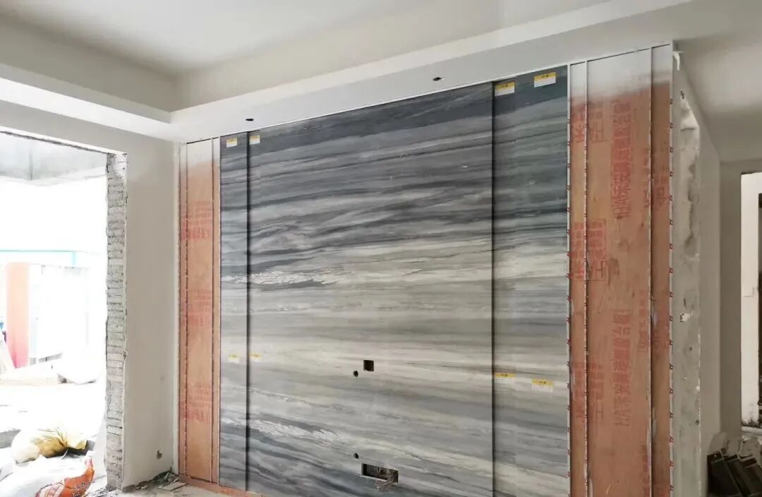 运用材料:自攻螺丝石材干挂AB胶石材专用云石胶结构胶、铜线木板基底背景墙安装