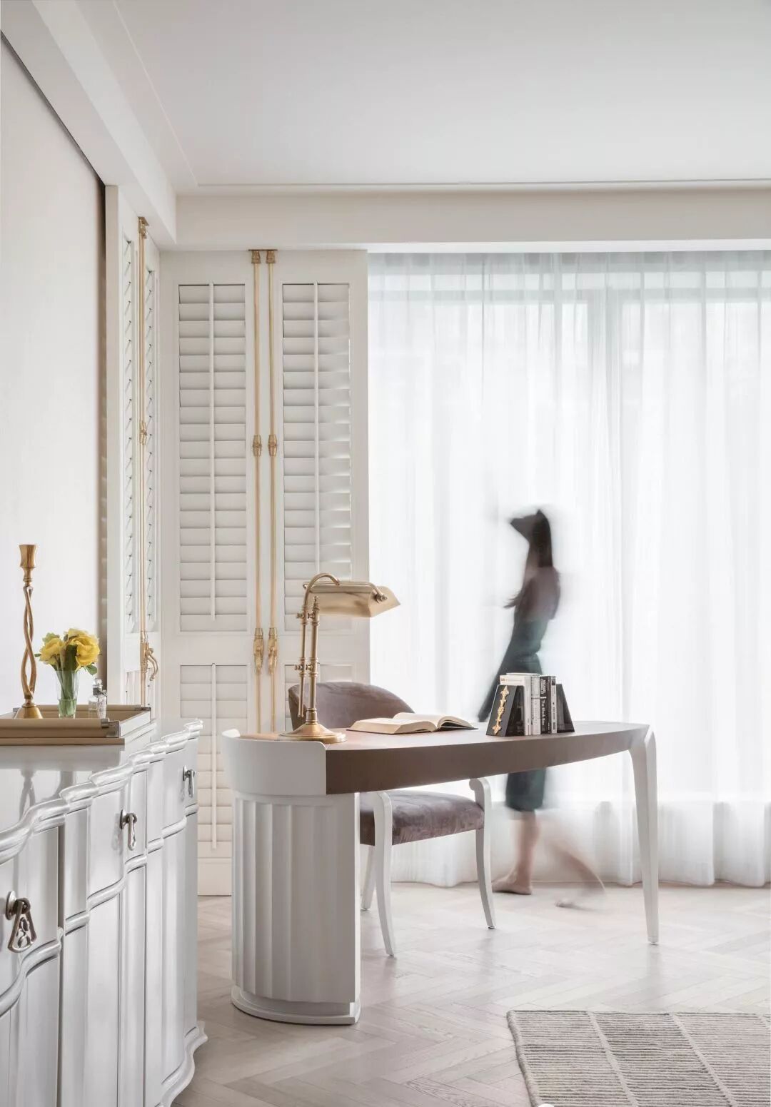 空间中糅合了现代中式元素,复古的白色木质百叶门在这里不再是窗前的风景,而是变身为墙角的装饰背景。