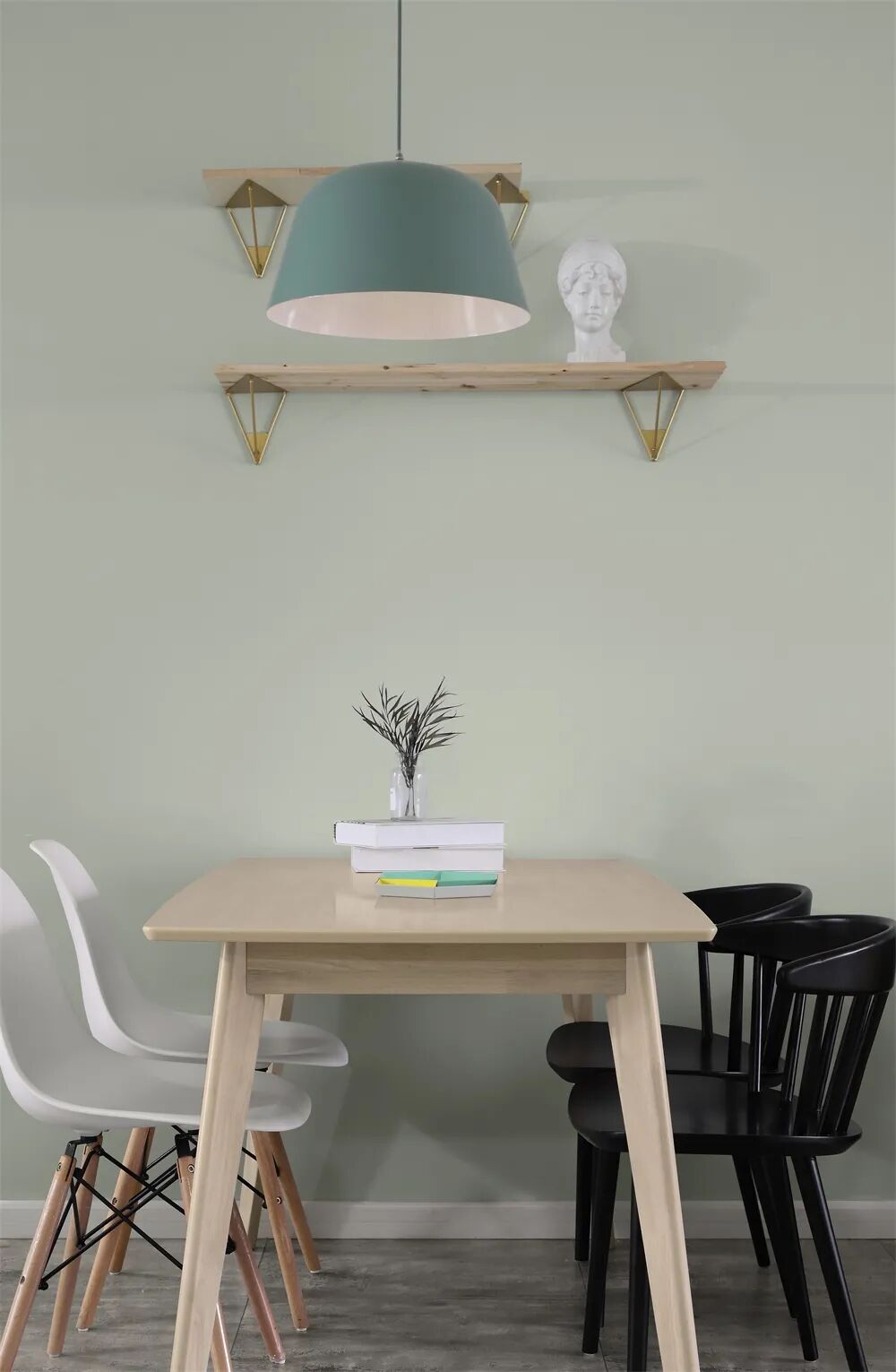 客餐厅一体效果图~从这里我们可以看到不管是餐厅还是客厅,墙面都是粉刷的小清新之浅绿色的乳胶漆,然后搭配白色平顶式天花板,效果非常不错