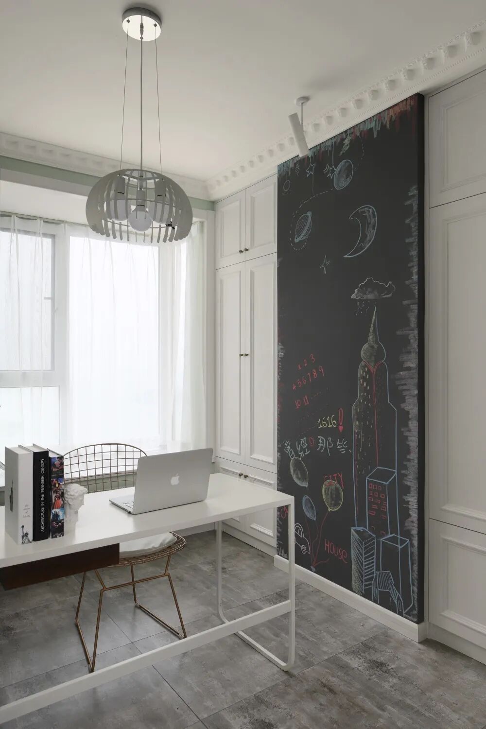 而且你看,这个书房还设有一面黑板墙呢,这个黑板墙的设计不仅可以满足孩子涂鸦的需求,同时也带来一份美好的装饰