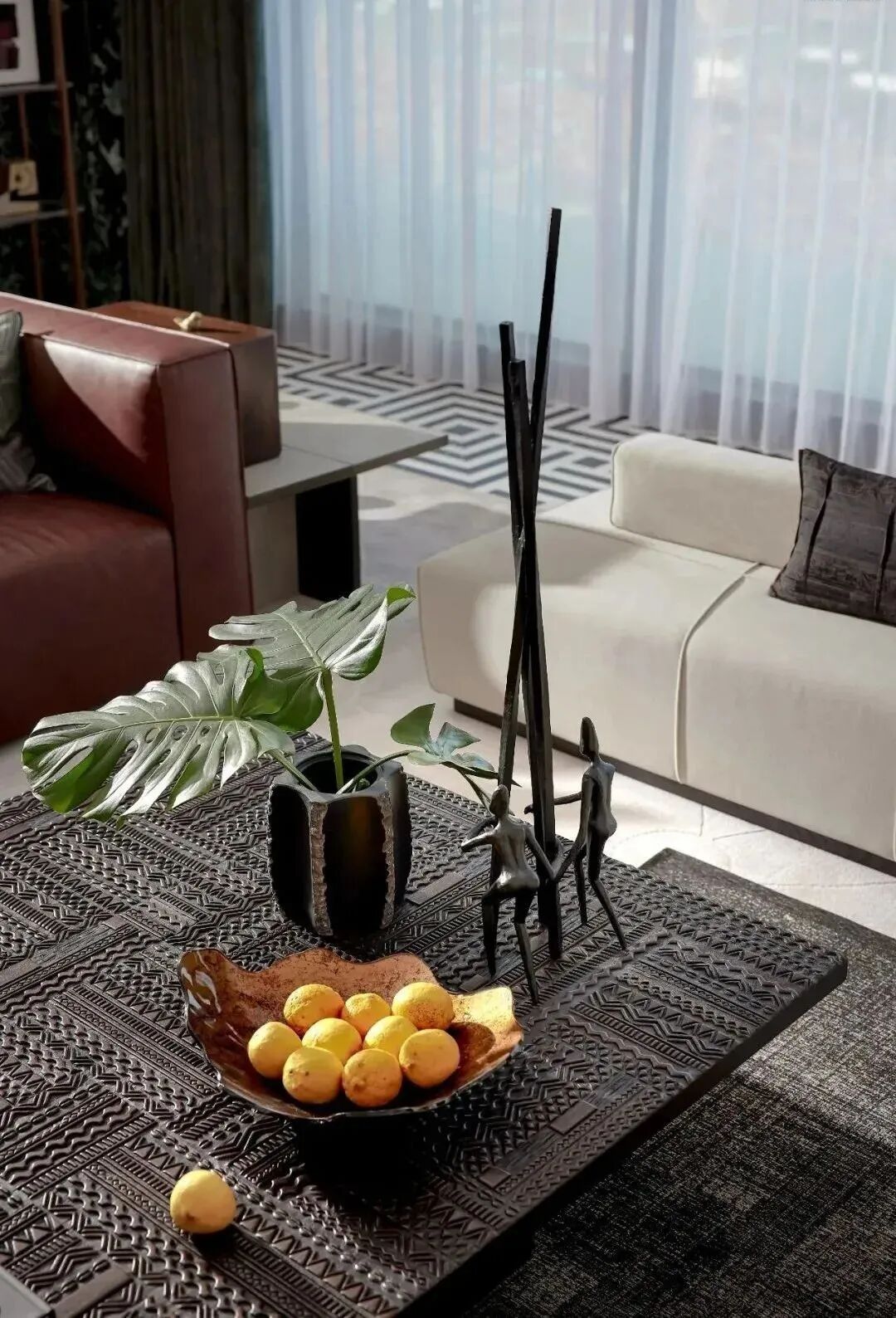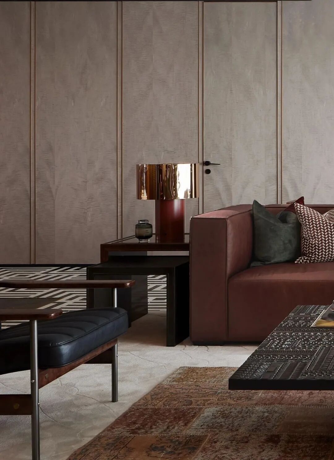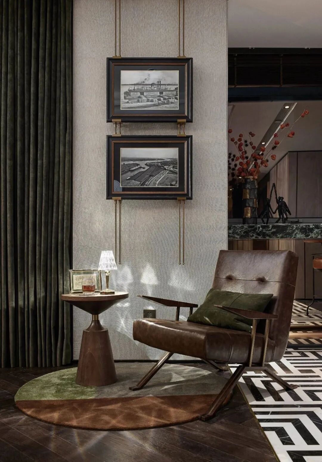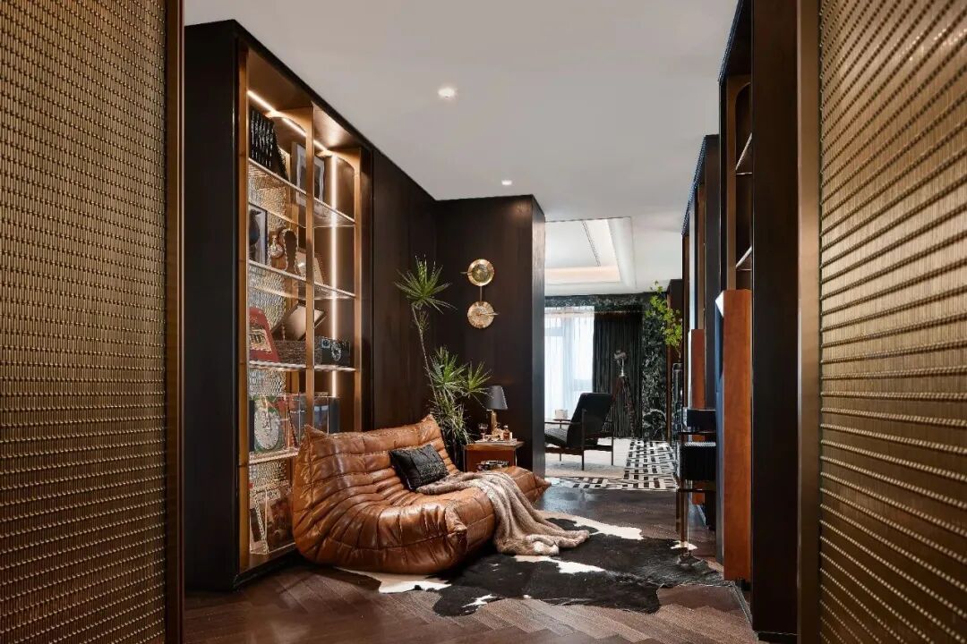 黄铜与木的大胆碰撞,让空间充满“重金属”音乐的质感,从世界各地淘回来藏物,又给空间增添了一份人文情怀