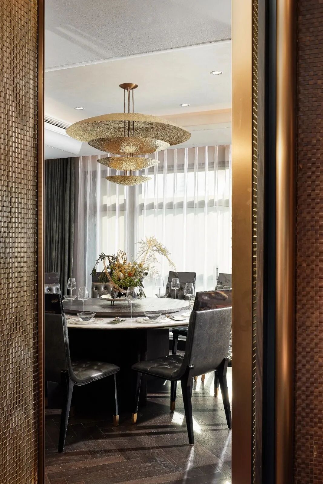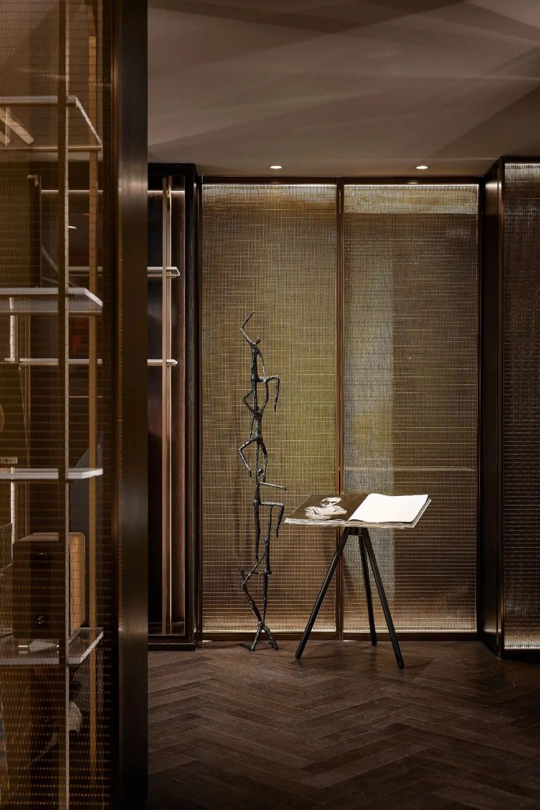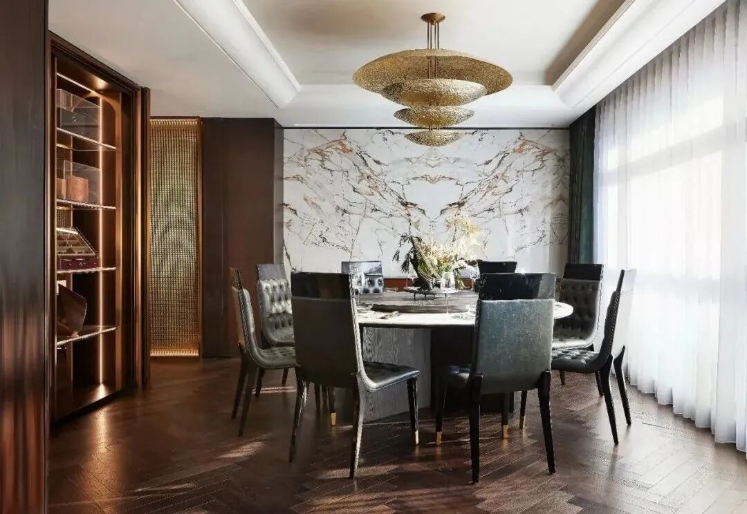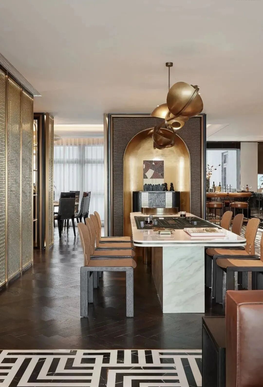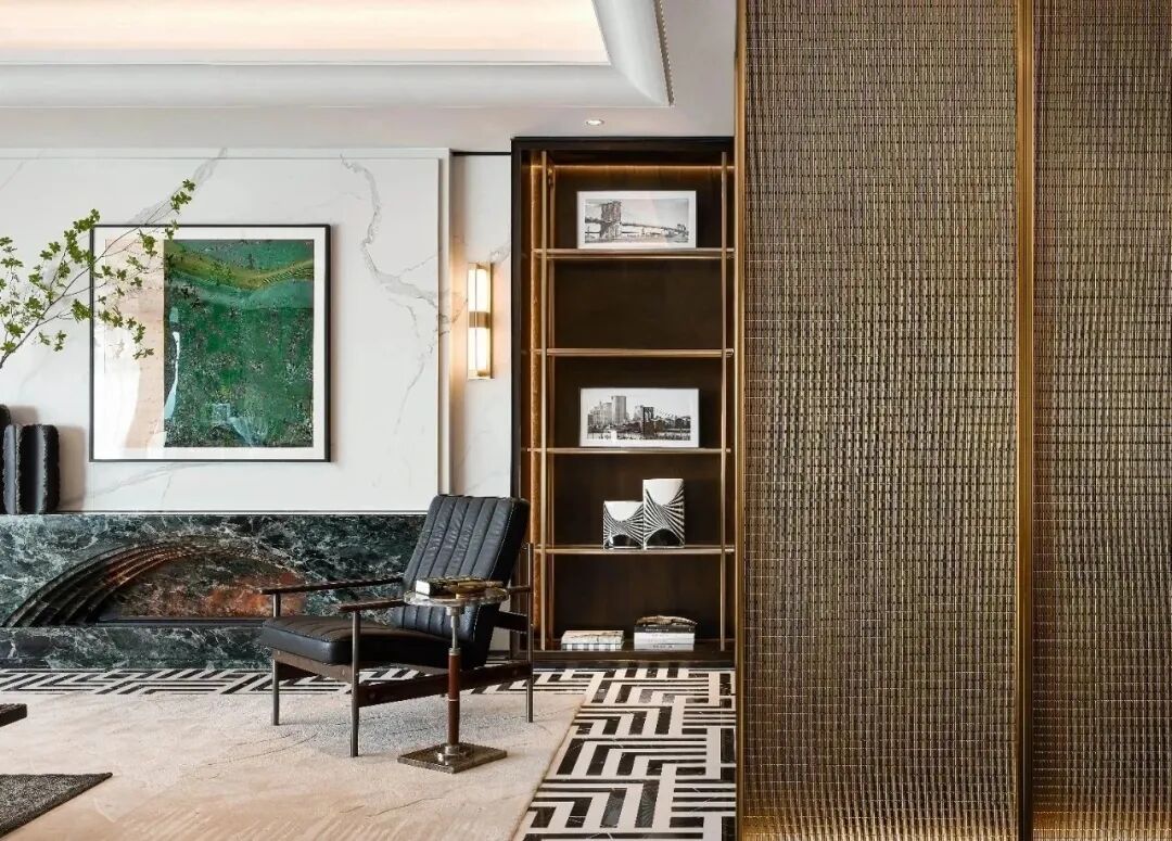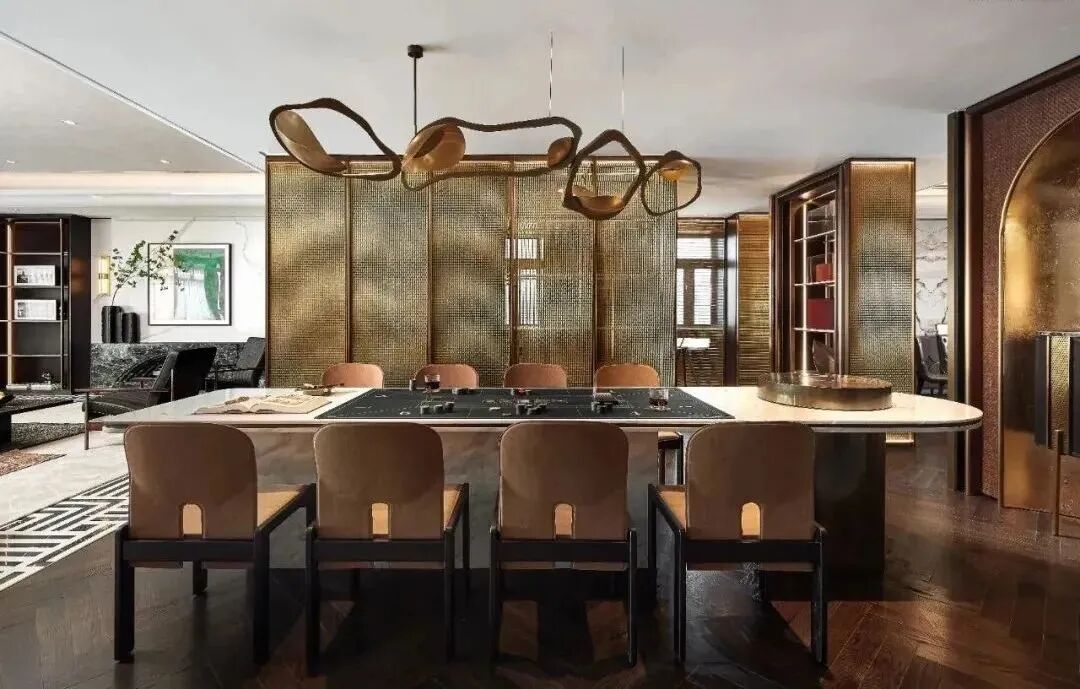 各空间没有做特别的区分,会客区、休闲区、宴会区、品酒区等既相互独立又联通。作为私人会所,功能空间的设计隐约带有英式俱乐部的影子,定制的金属网屏风,带着一丝《了不起的盖茨比》酒会场景的高贵感,营造了浓烈的PARTY氛围