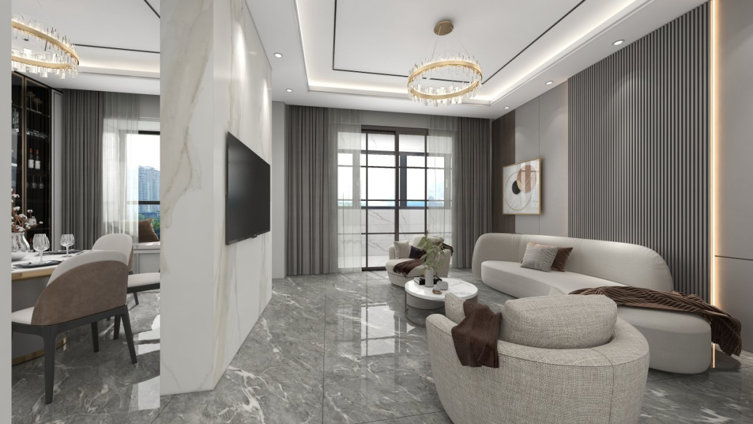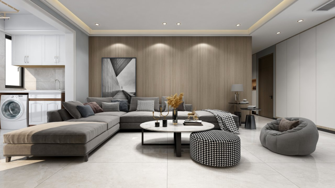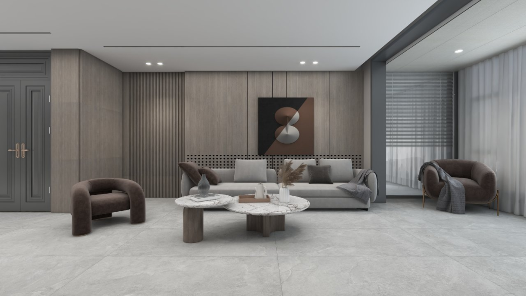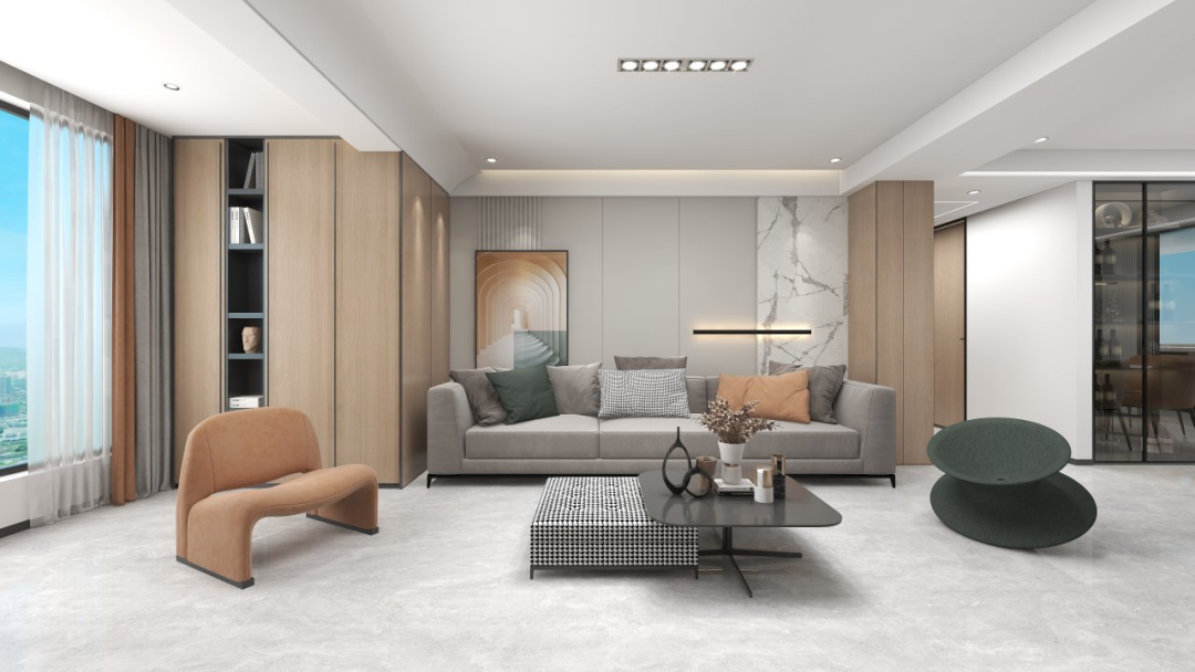 对于大户型,可以选择使用深色的地砖来制造一种深邃感,同时可以选择用浅色调为主的墙面进行调和,或者使用柔软质地的窗帘、色彩明艳的抱枕等等进行空间的提亮与点缀,突出空间的活泼感和舒适感。