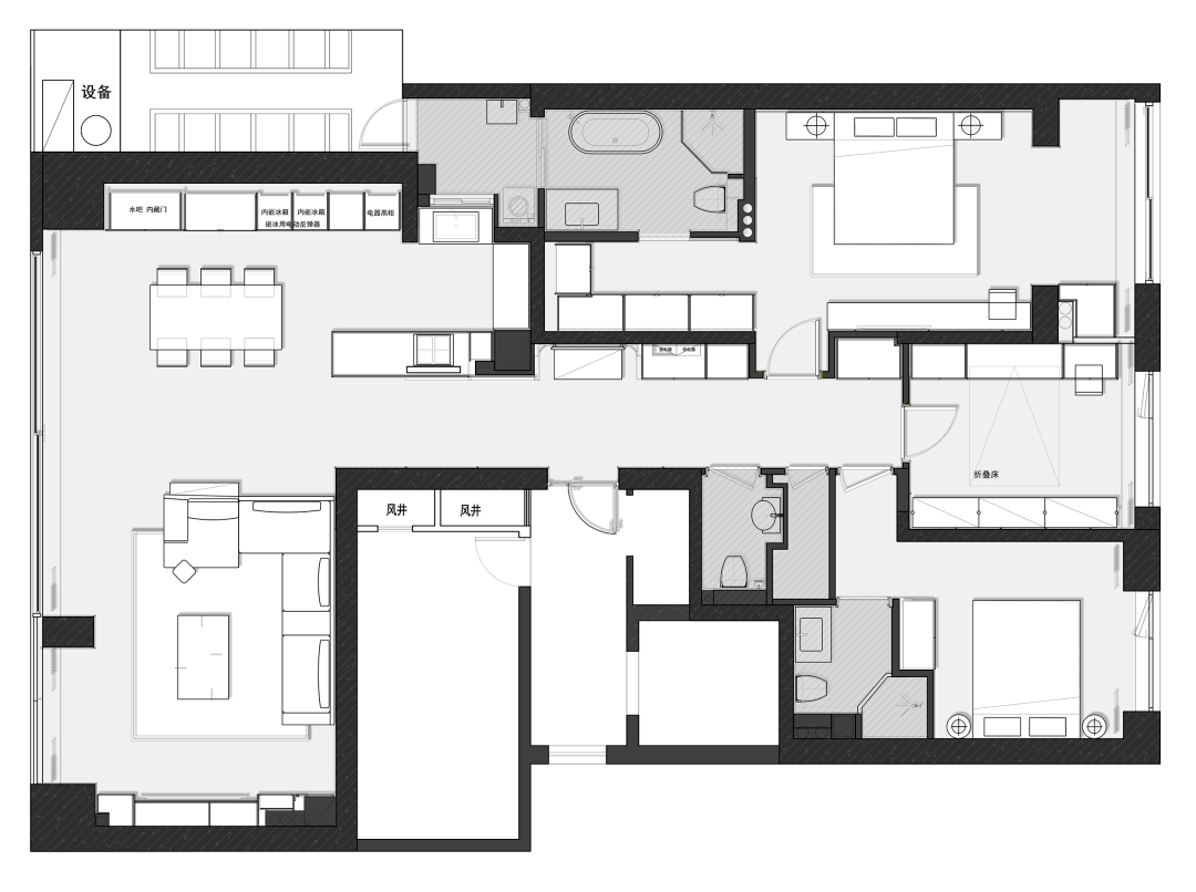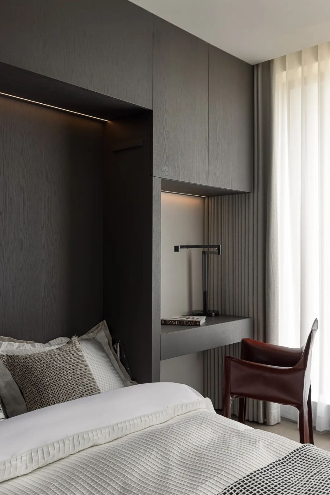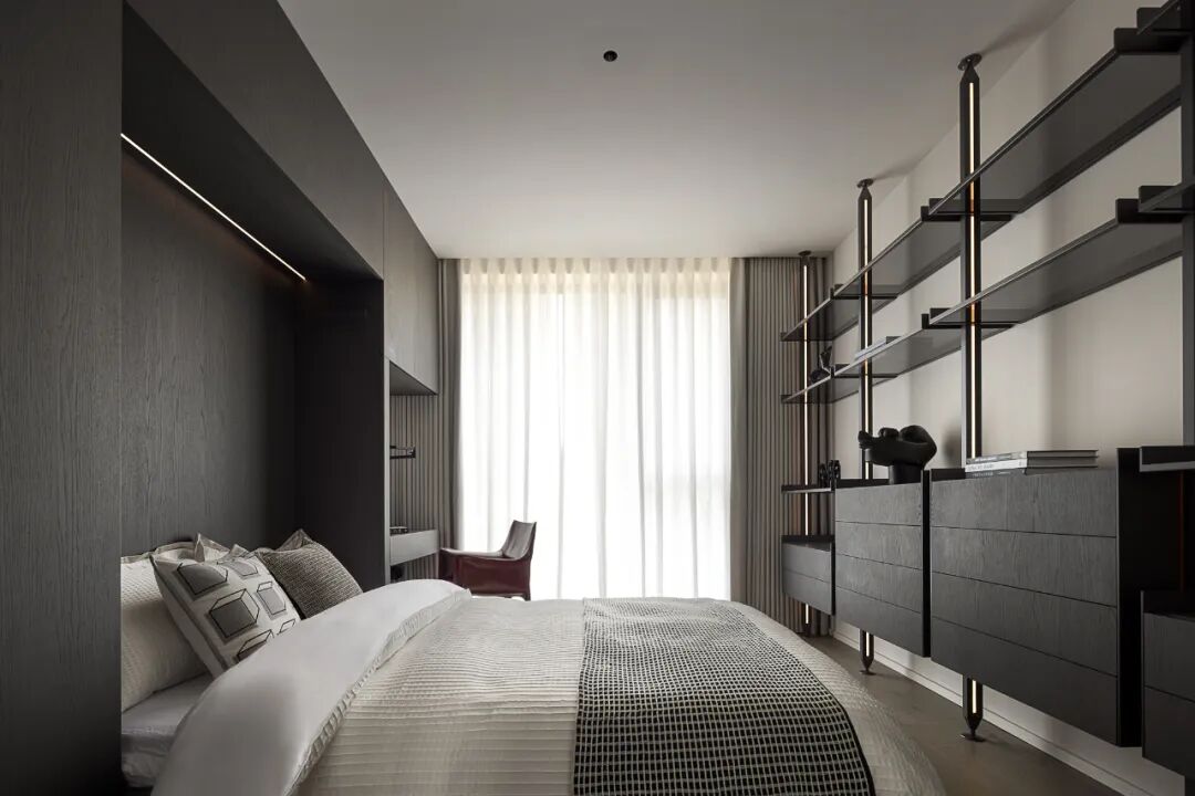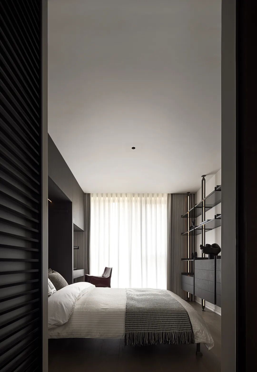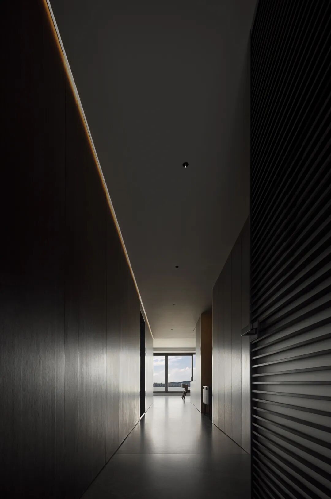 独梯独户的公共过道推门而入,门厅连接着内通道,平面图上二维的线条站立起来,转换成室内外情绪转换的空间。以端景台为轴线,左侧布置为公共的动区,右侧则为私密的静区。合理的动静分区,界定了场所的具体功能和空间的使用形式。