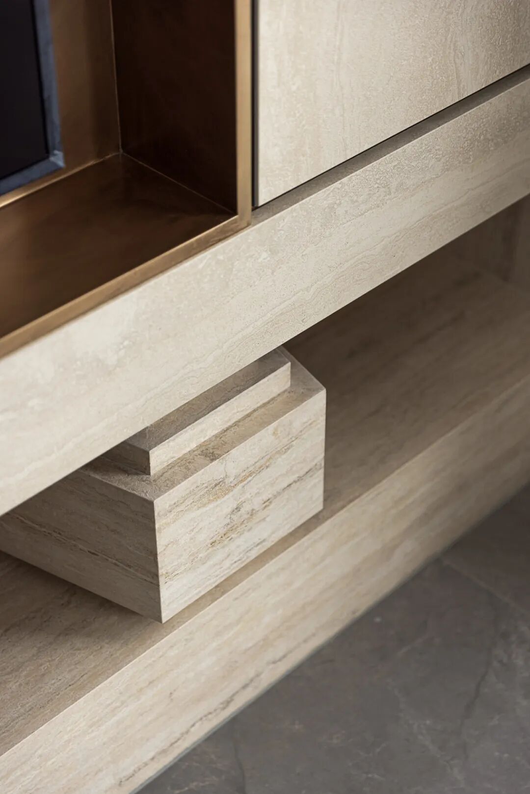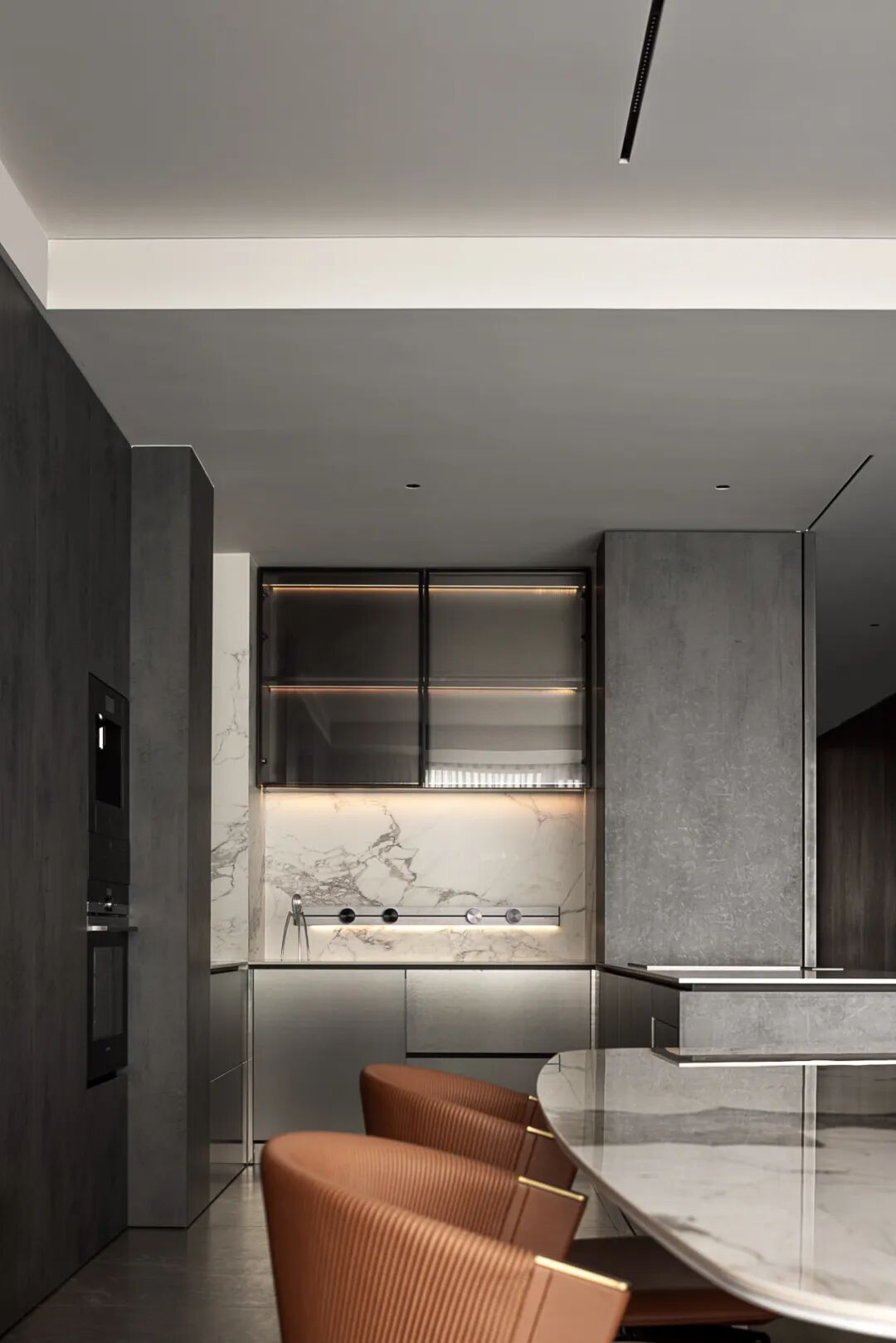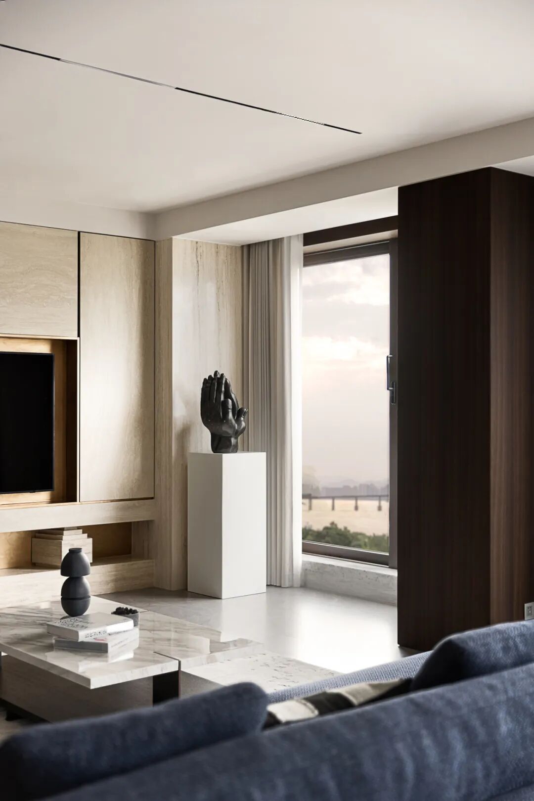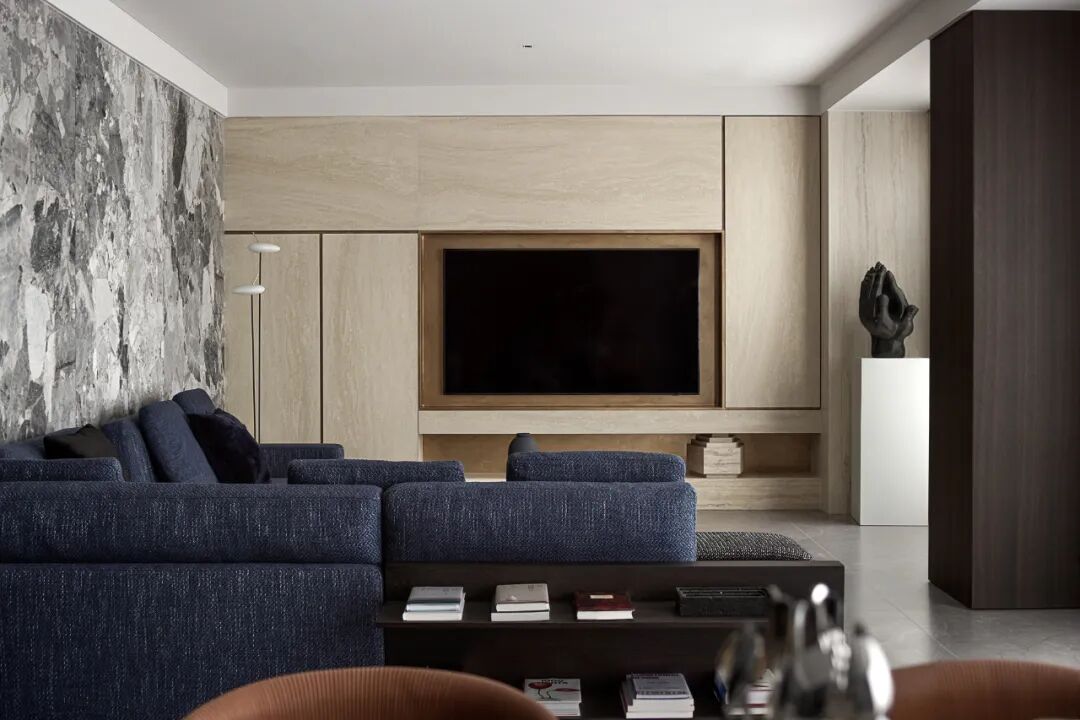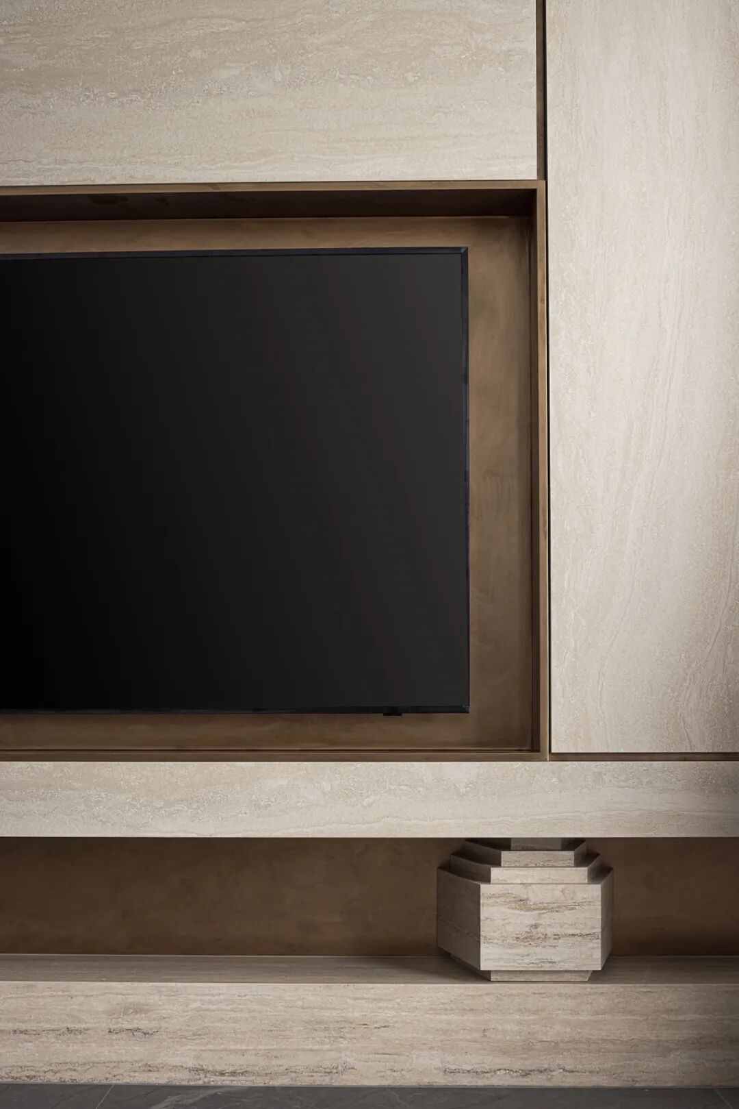 作为客厅的主角,由金属线条切割而出的方形洞石体块以非对称的方式,追求“对称的美学秩序”。引人注目的、逐级内退的造型石墩,于整体立面构成之中,展示着“四两拨千斤”的力量感。满足内嵌的电视机位,外凸的深度同时为暗藏式的柜体收纳,融功能兼形式于一体。