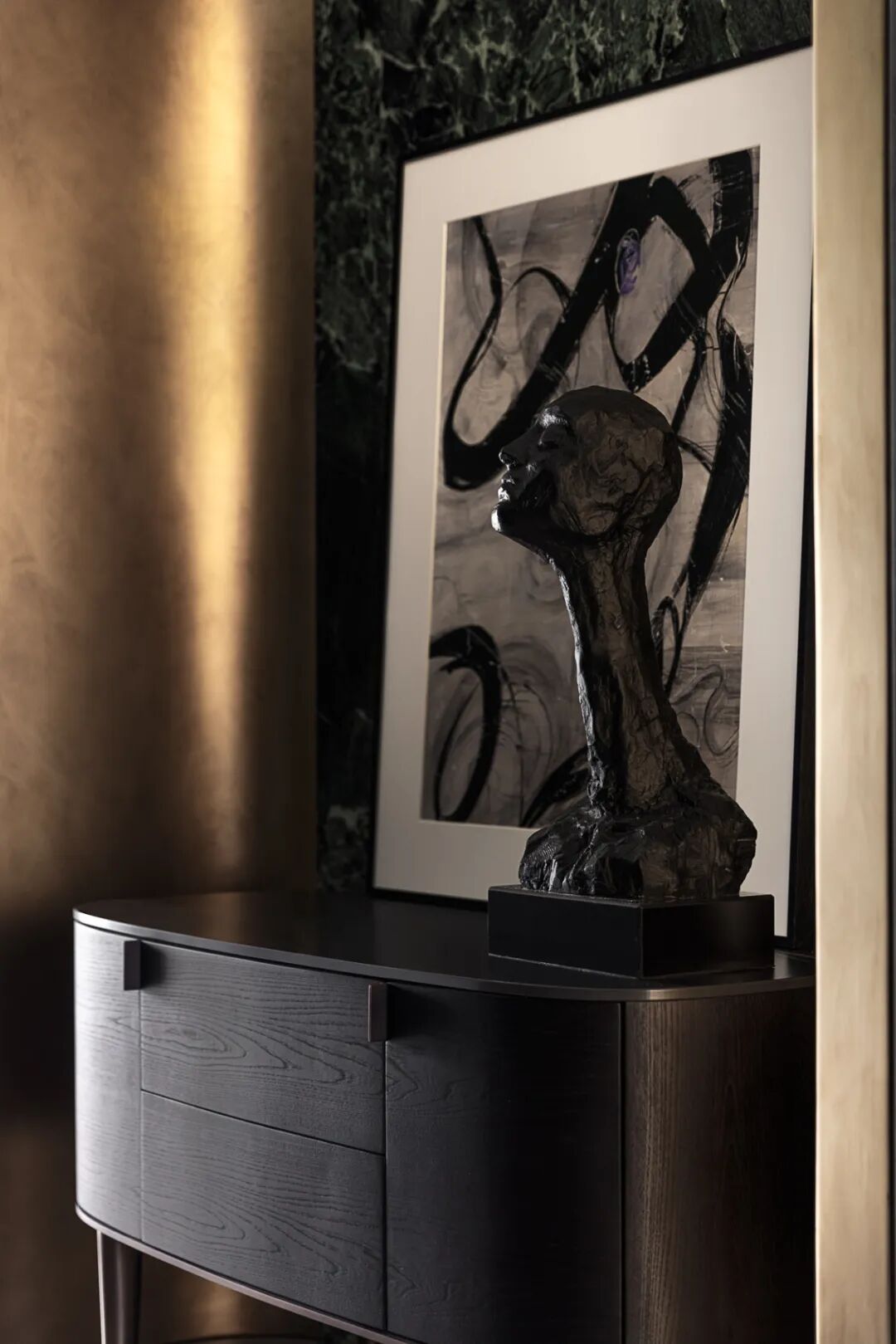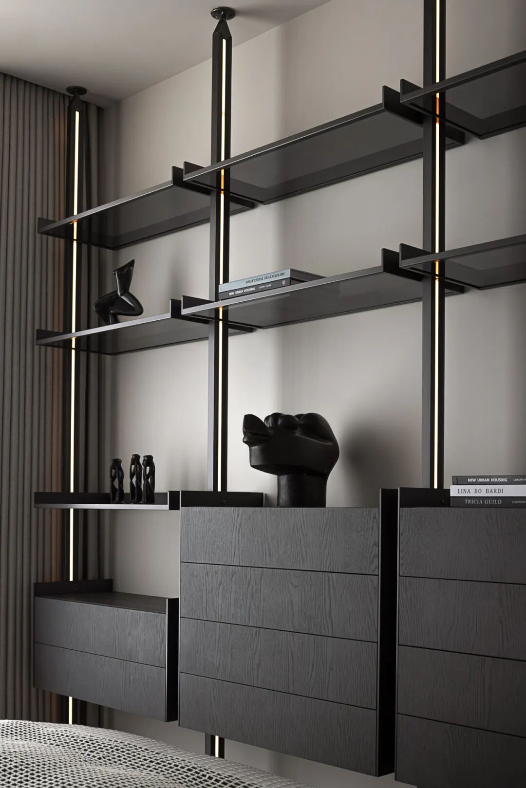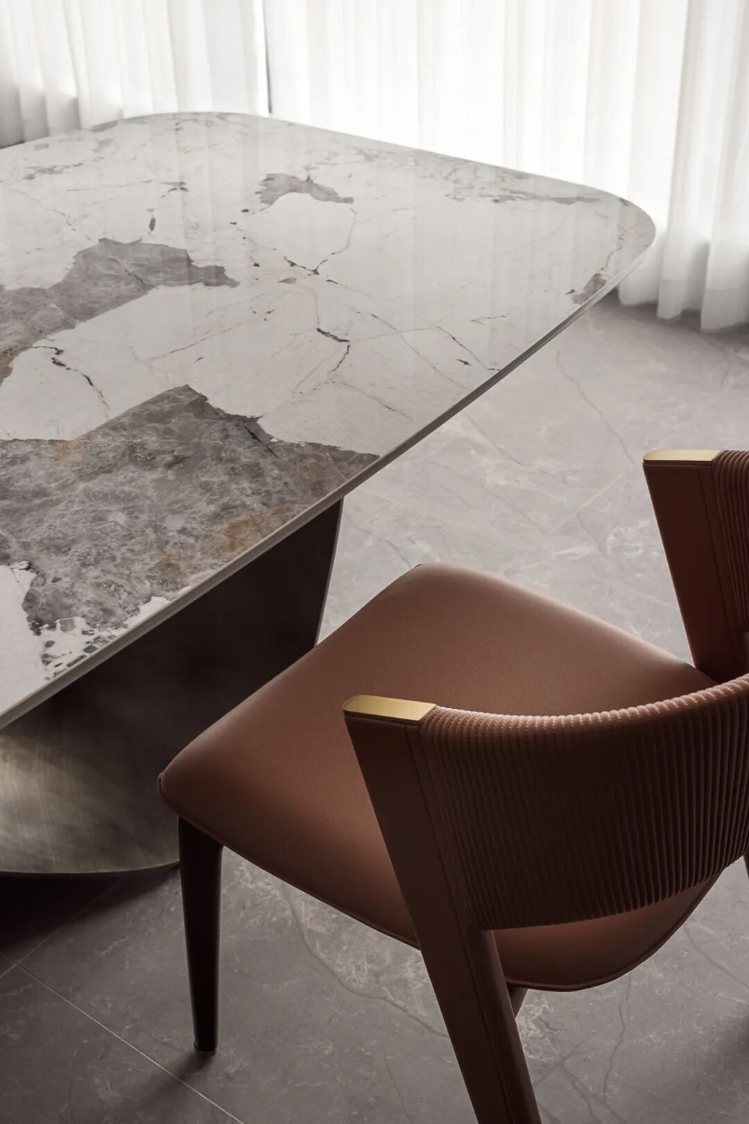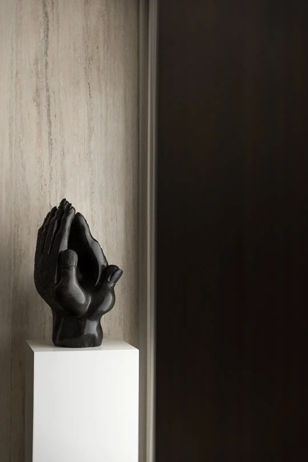 作为客厅的主角,由金属线条切割而出的方形洞石体块以非对称的方式,追求“对称的美学秩序”。引人注目的、逐级内退的造型石墩,于整体立面构成之中,展示着“四两拨千斤”的力量感。满足内嵌的电视机位,外凸的深度同时为暗藏式的柜体收纳,融功能兼形式于一体。