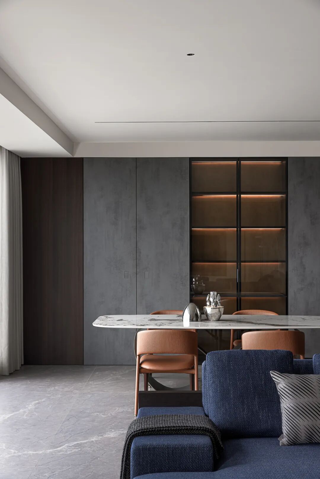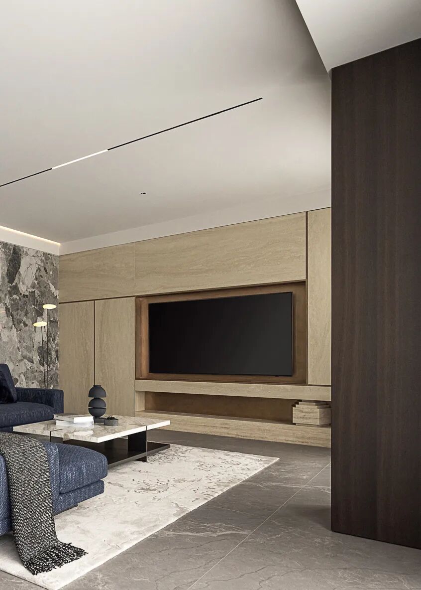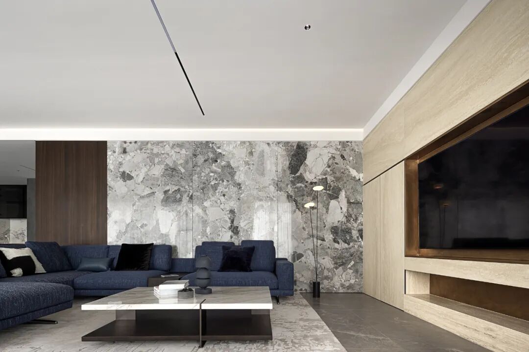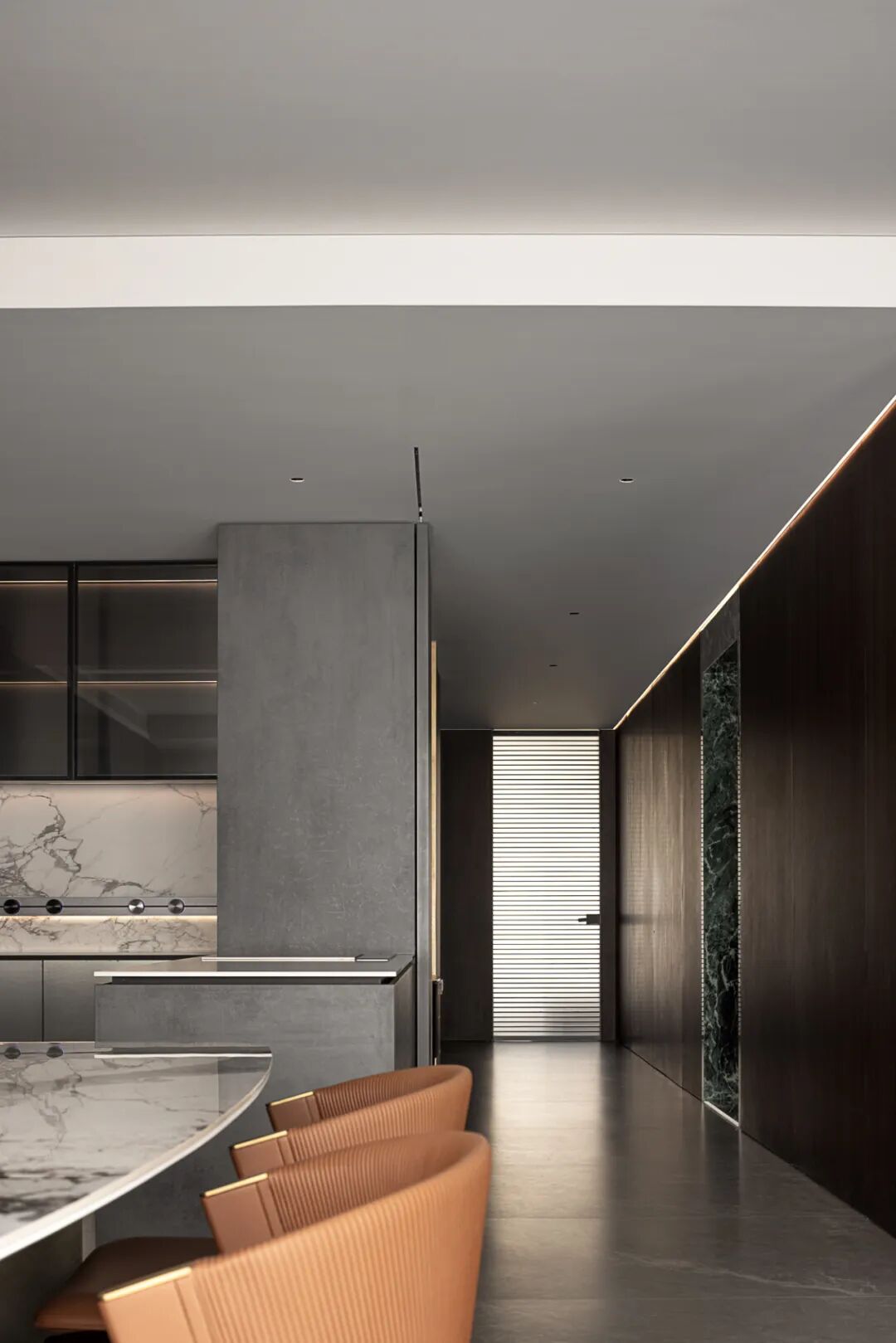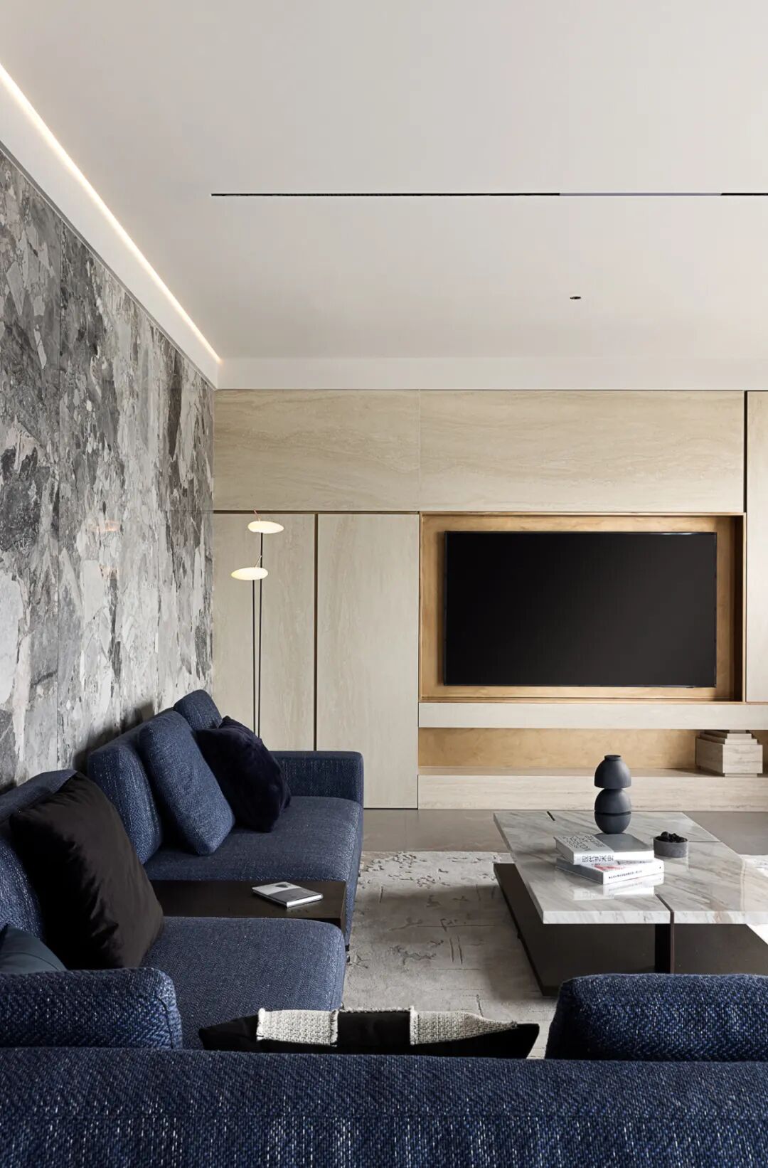 由过道转折而来的木作饰面以一定的比例,构成了客厅墙面的背景基底,天然木作和仿石材肌理的岩板形成鲜明的对比,颜色的深与浅、温暖与冷调、柔软与硬朗、哑面与亮光,两种不同的材料表情于细节收口处,碰撞出戏剧性的视觉效果。