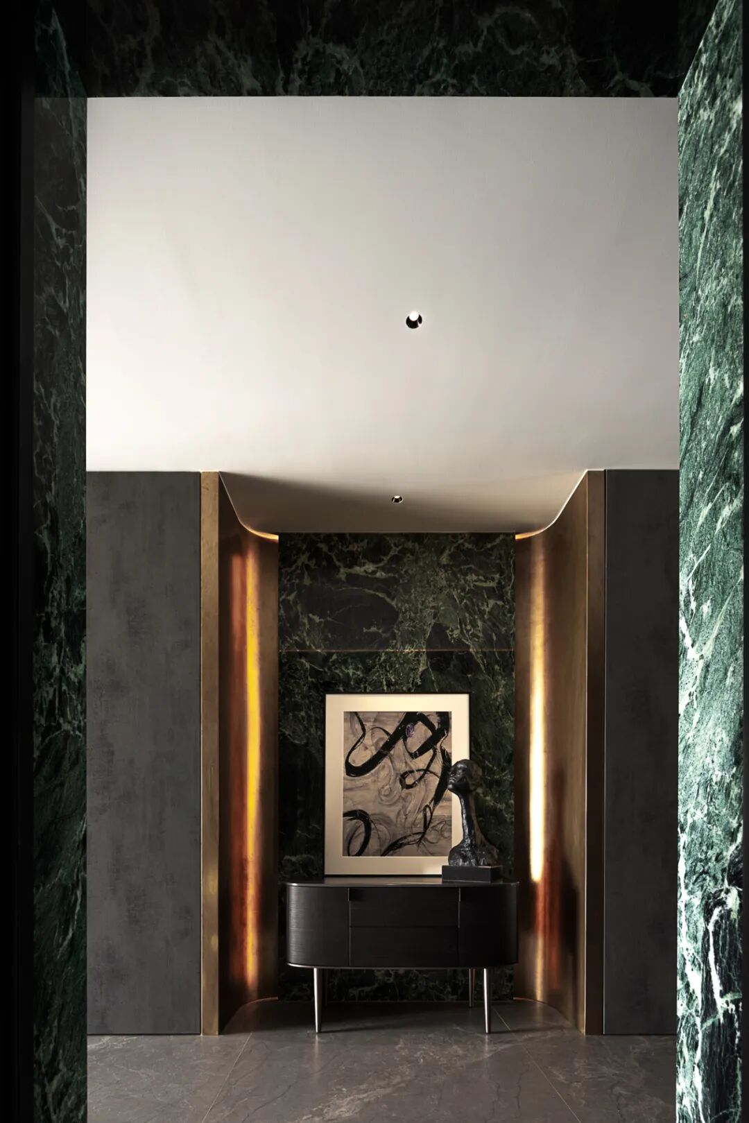 不同于交标的入户门样式及常规的门套做法,具有视觉表现力的松石绿成为入口隆重的仪式语言,毫无规则可循的天然纹理,以恰到好处的神态点缀着玄关,呈现出“开门见山”的对景式结构,同时与门套的材料语言形成遥相呼应的有机体。