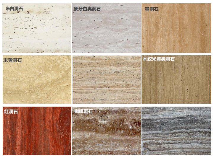 通常洞石主要有灰白、米白、米黄、黄色、金黄、褐色、咖啡、浅红、褐红色等种颜色,少部分有绿