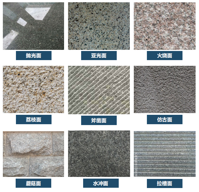 为了保持洞石原有质感及纹理,一般分为抛光面、亚光面和自然面,不做过多加工处理。