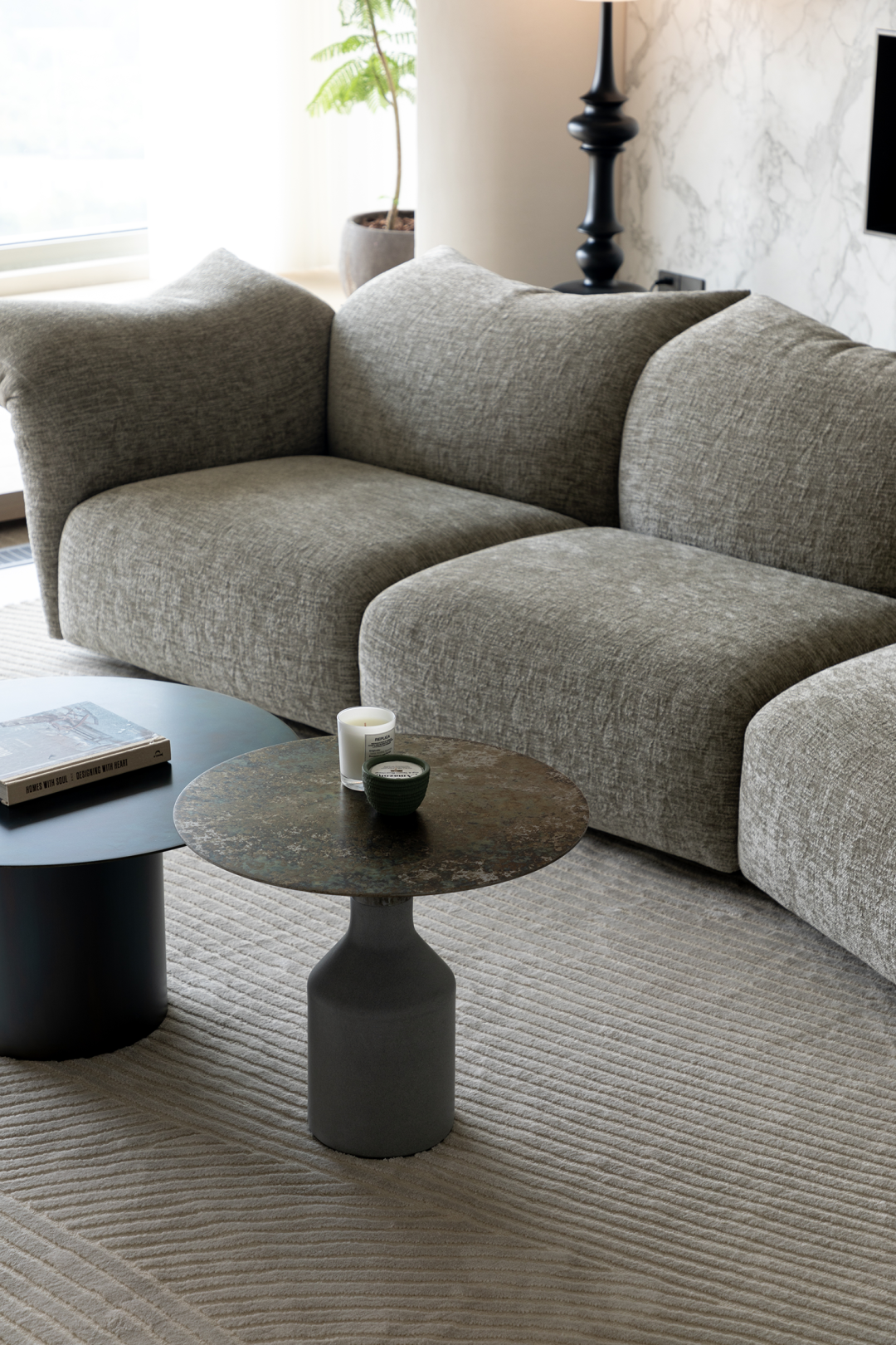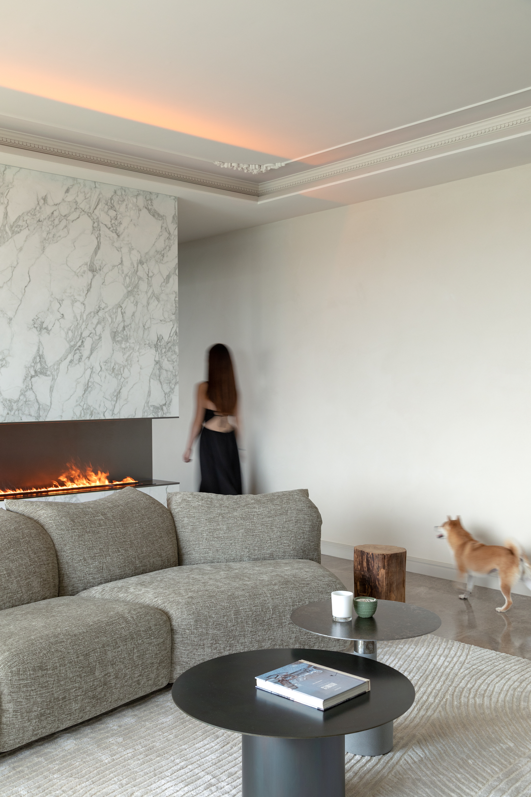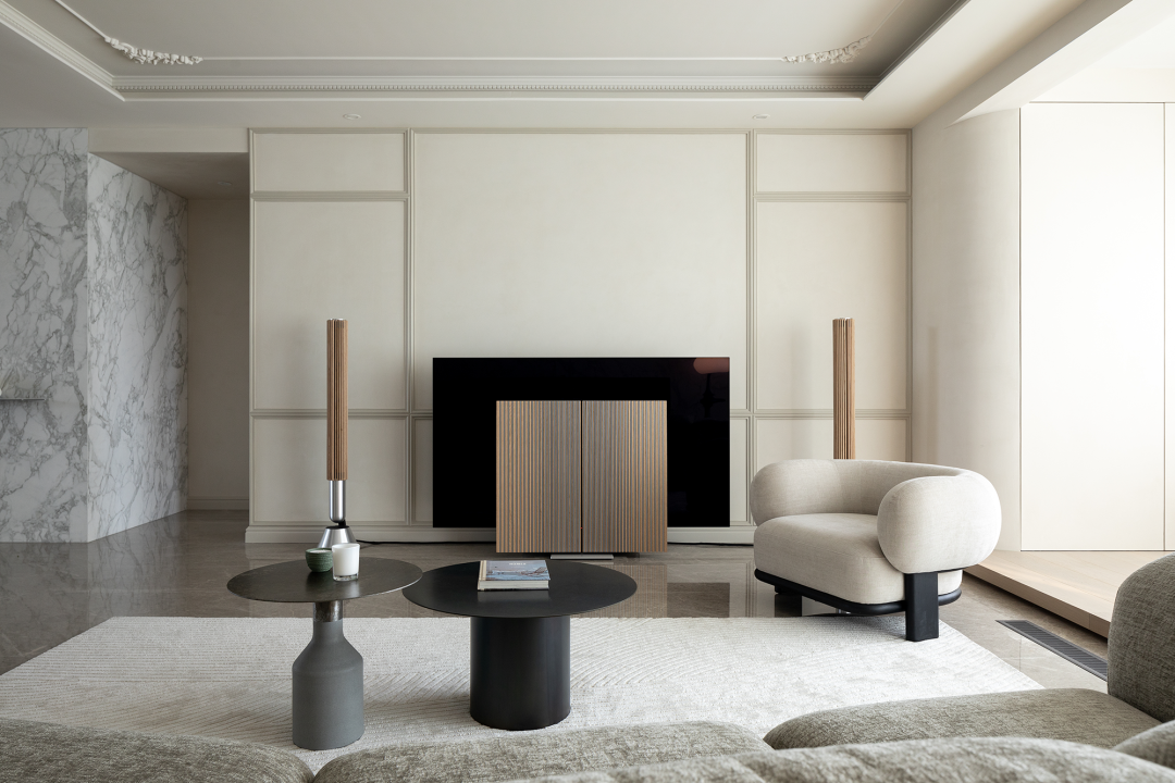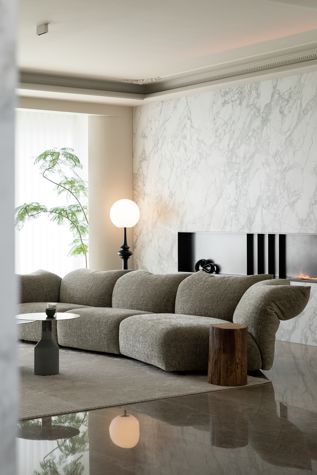 简约优雅的电视墙反而凸显音响设备的高级质感。家具多以弧线型的包裹感诠释舒适与温馨的第一要义。壁炉则以沙发高度为参照,在石材的纹路背景下火光熠熠,立体了空间的纵深记忆,为“流动”姿态增添时光烟火的温度与诗意。