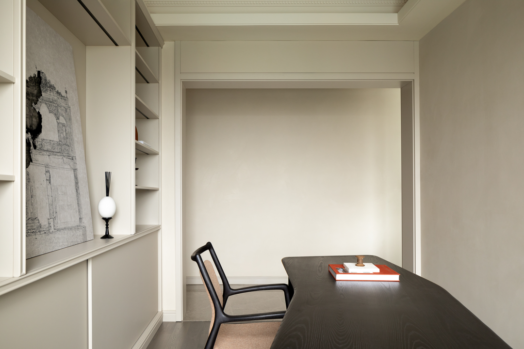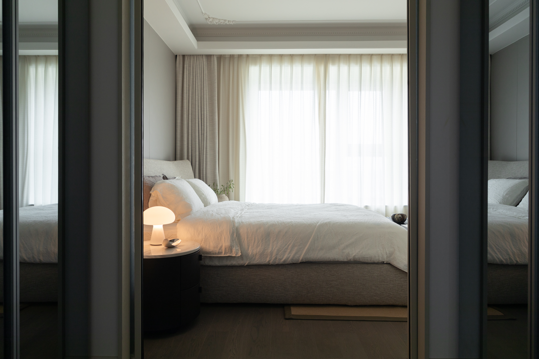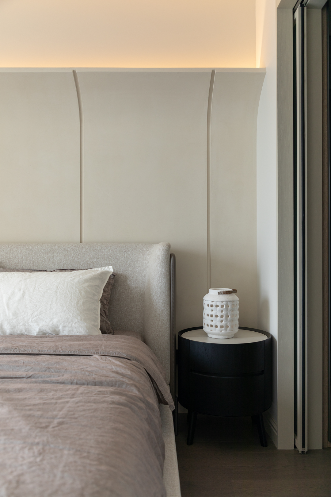 低饱和度的空间背景让自然光多次漫反射后愈发柔和,无主灯结构的间接光环境构筑温馨质感。大地色系搭配深深浅浅的木质系统,让卧室和书房弥漫着内在的沉浸气息,利用色块差异勾勒层次,自然而然形成视觉的缓冲与递进。