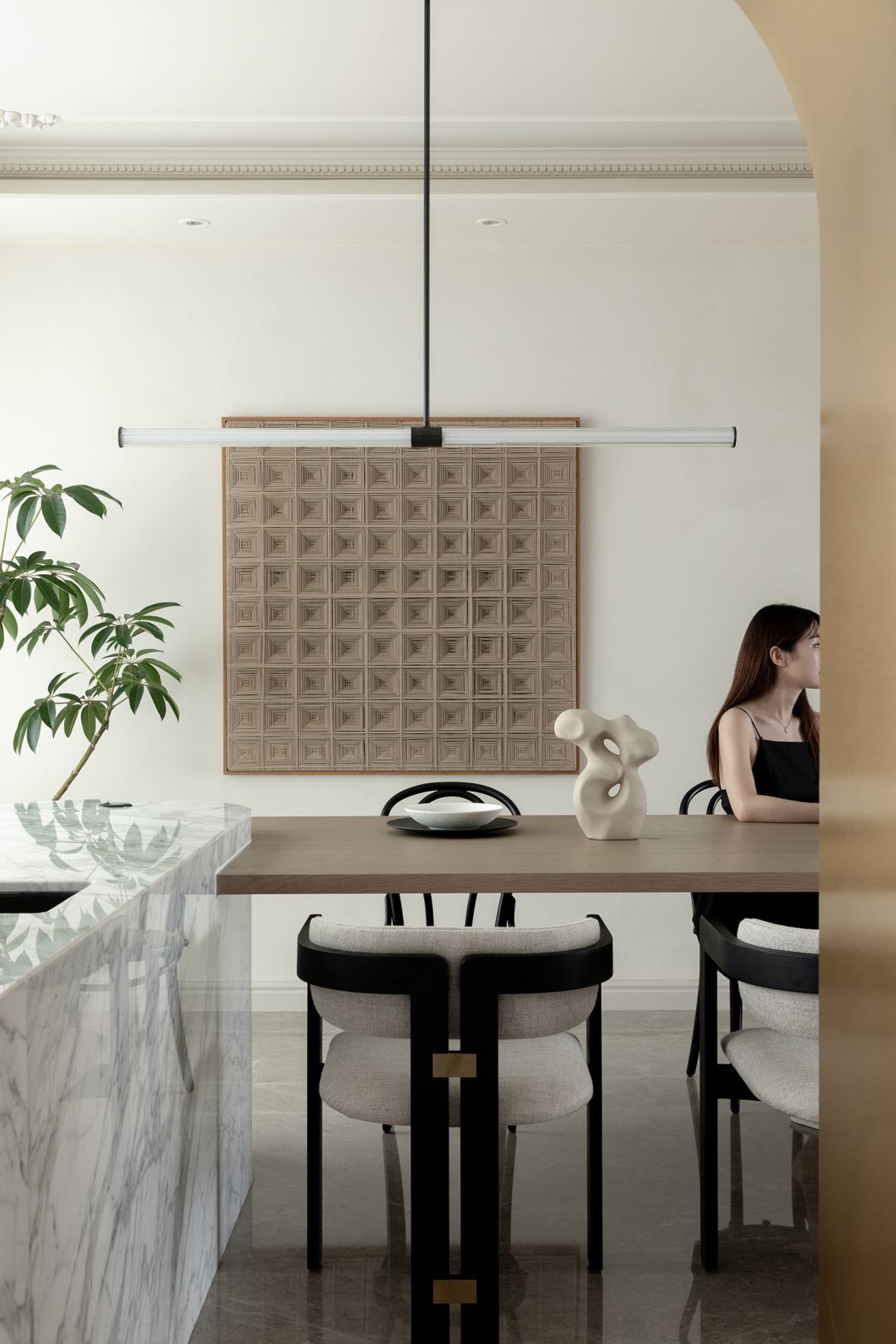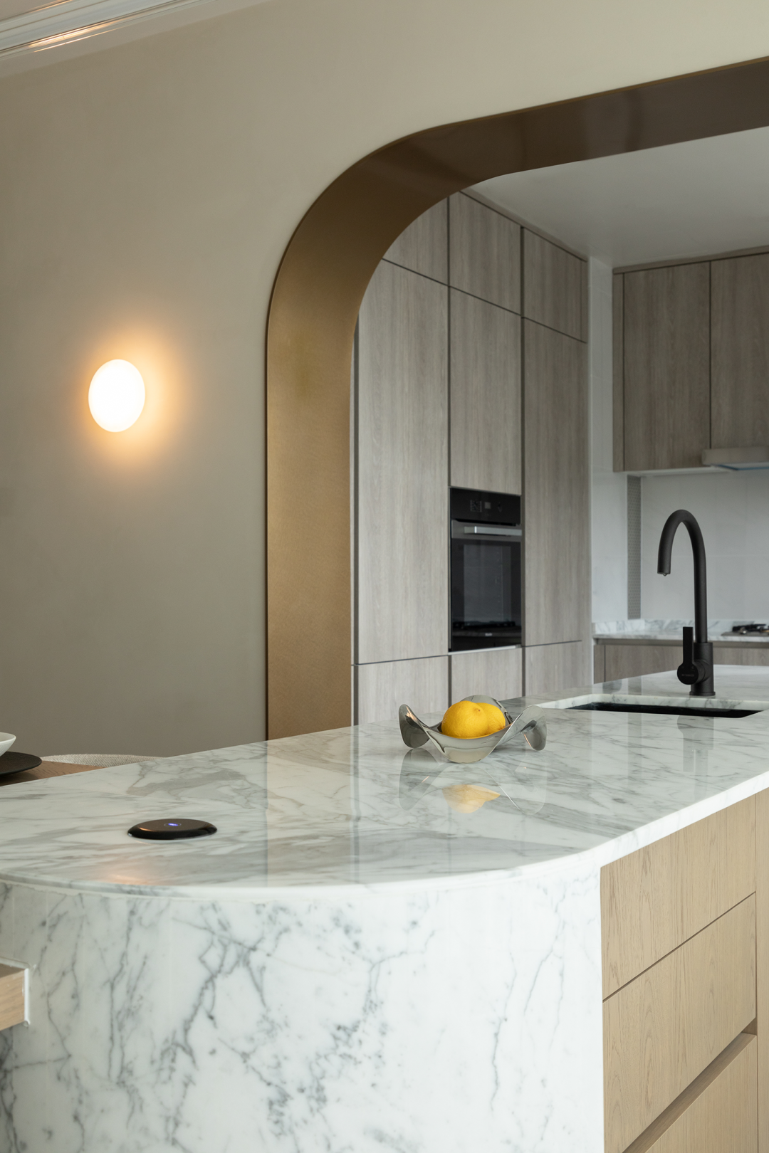开放式厨房将岛台延伸至餐桌,形成一体式的就餐、咖啡、吧台、社交区域,去繁至简的设计激发轻快自然的都市时尚行为方式,也为包容和谐的家庭互动提供了更多可能性。