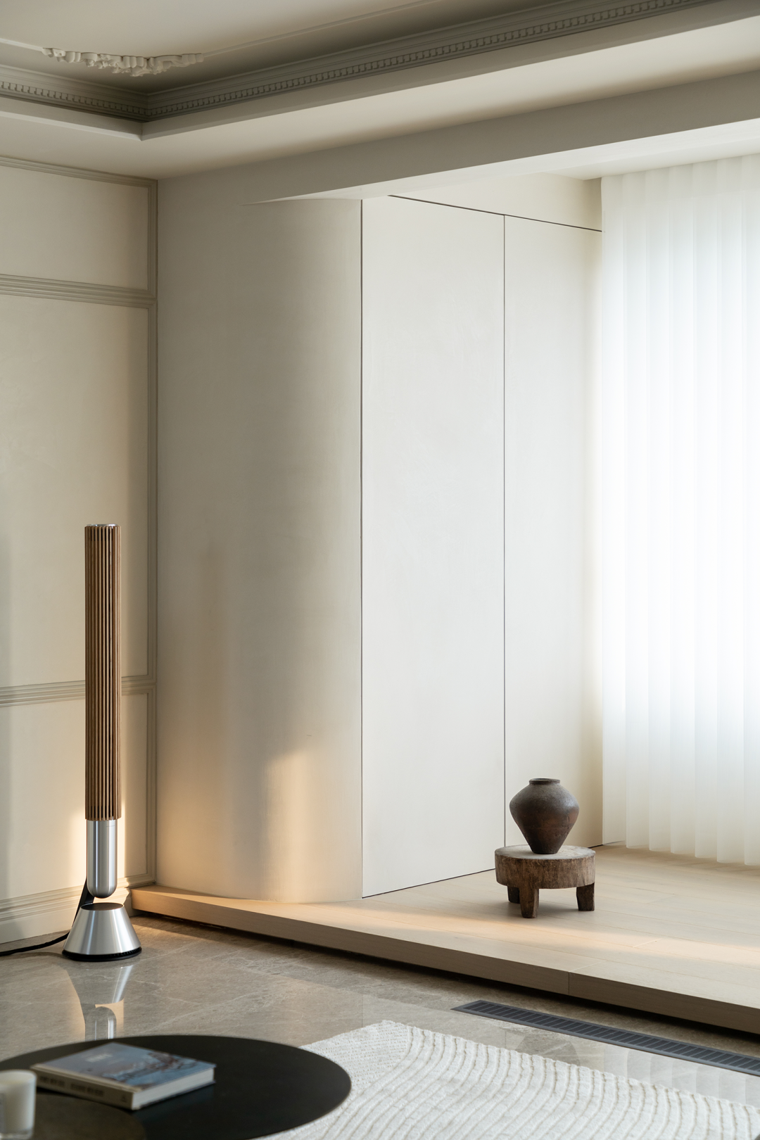 项目本身是一个全部顶面和部分墙面都布满毛细管的三恒房,设计上受到诸多限制。但约束条件是改造的难点更是创新的原点,寻求基于理性之上的感性演绎。在简单轮廓的空间整体中,入宅即映入眼帘的裸色主色调,缀以贴合大地系的原木色,还原源自生活的温柔肌理,这毫不费力的真实与高级感,为其注入法式美学的精神内核。