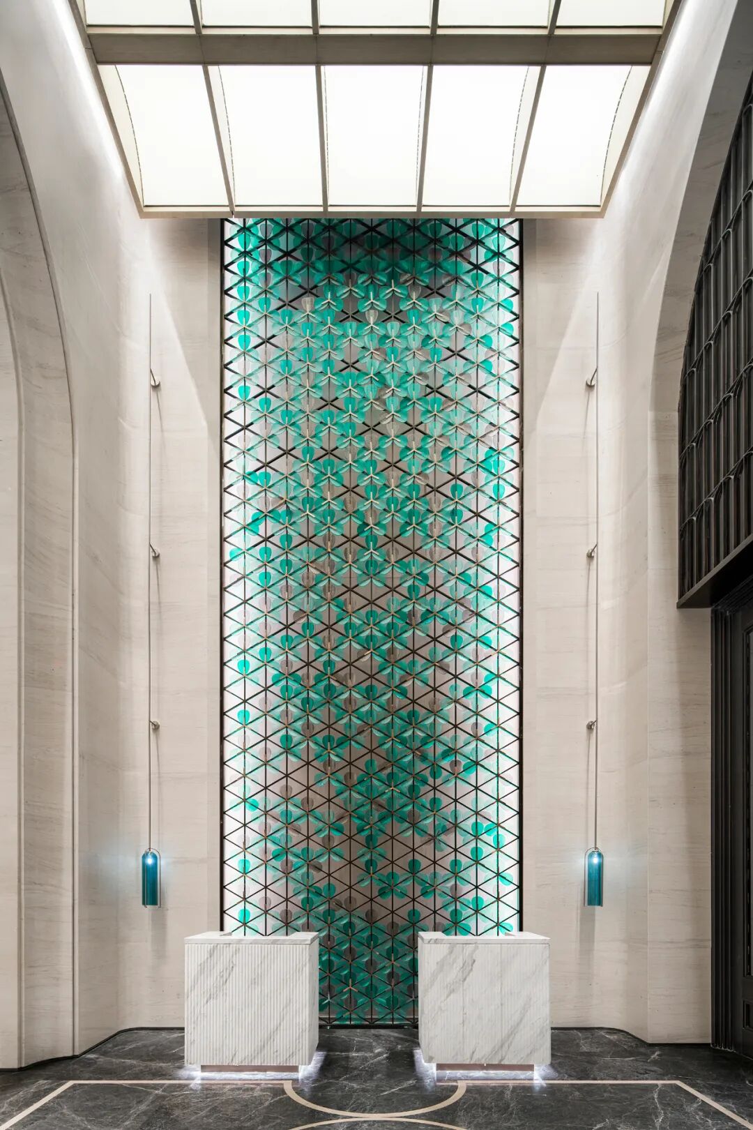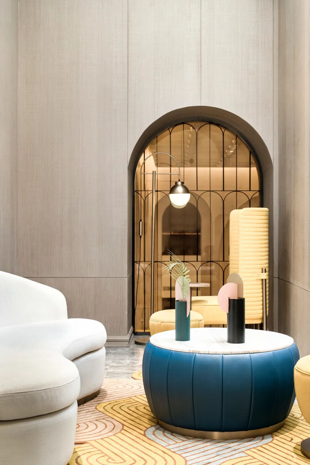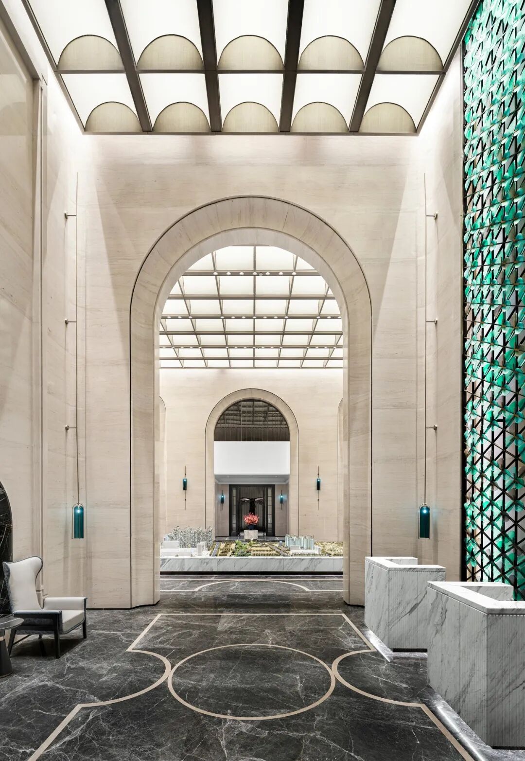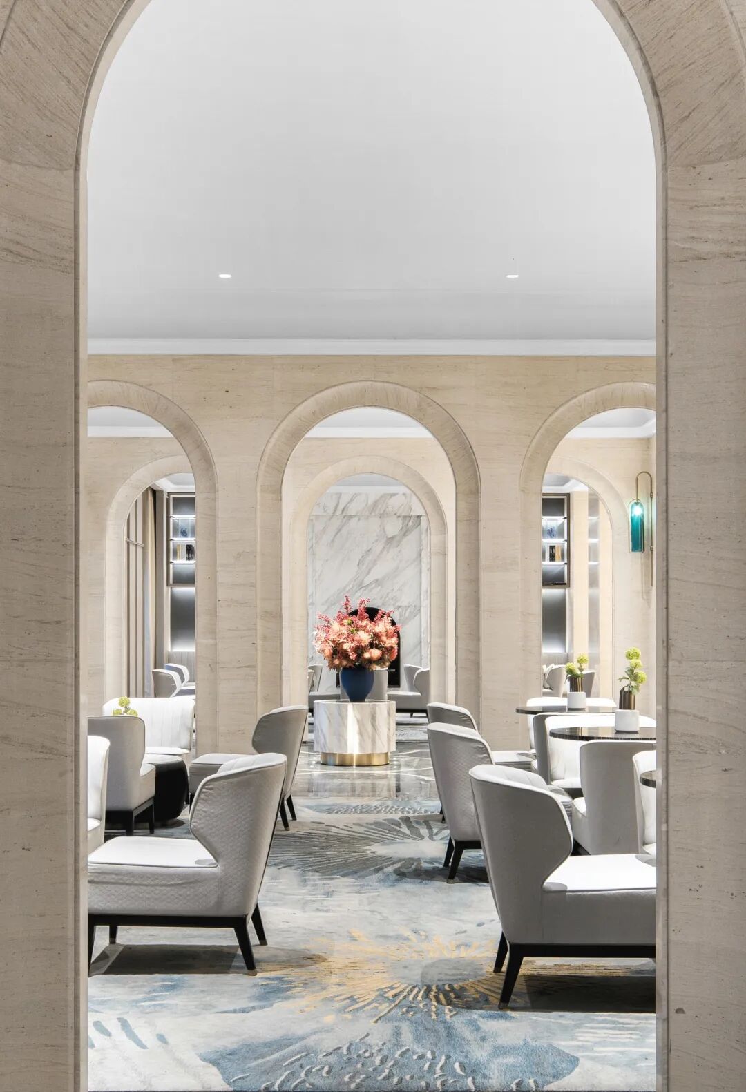 建筑风格以当代的审美视角重新诠释 Art Deco 美学,并延续至室内。设计在理性的、系统性的洞察下,避免过于复杂的肌理和装饰,灵活运用简化的手法,在保留优雅恢弘的雕塑感的同时,令空间整体威而不严,美且多情。