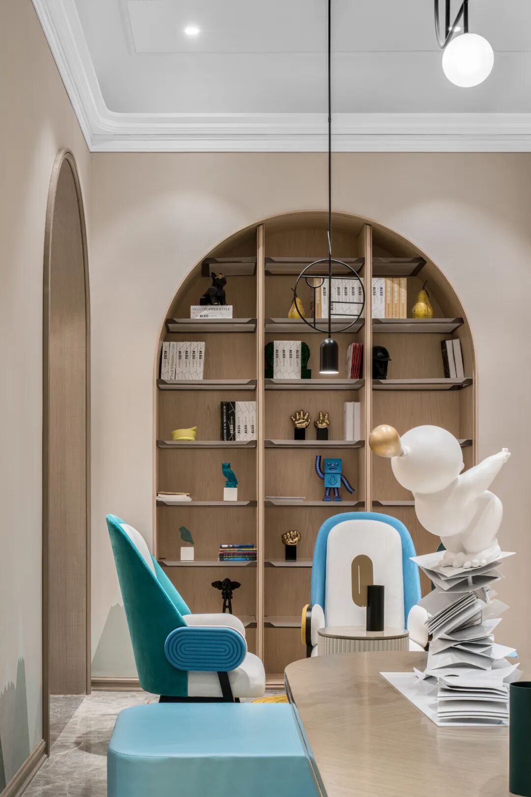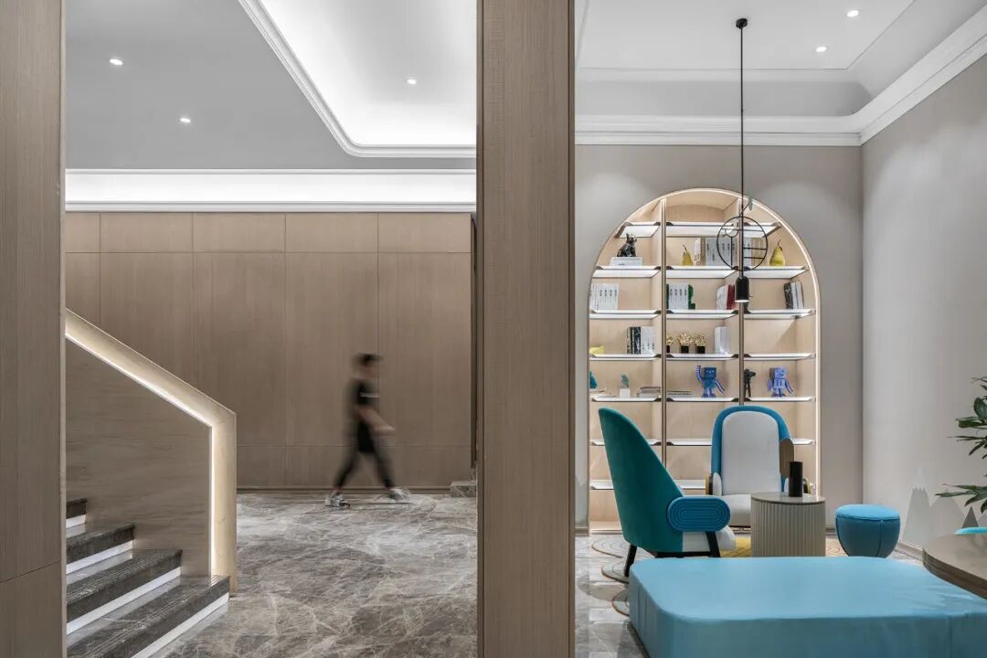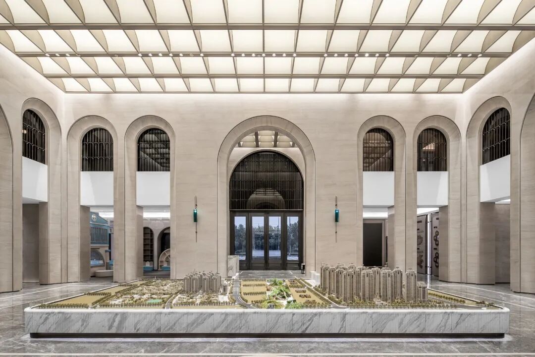 挑高的沙盘区以对称式布局,多扇拱形门洞排布出空间庄重大气的秩序美感。而在线条形制等细节上,设计则予以极致的简练手笔,铺陈出摩登优雅气质的同时,亦不过于繁复古板。