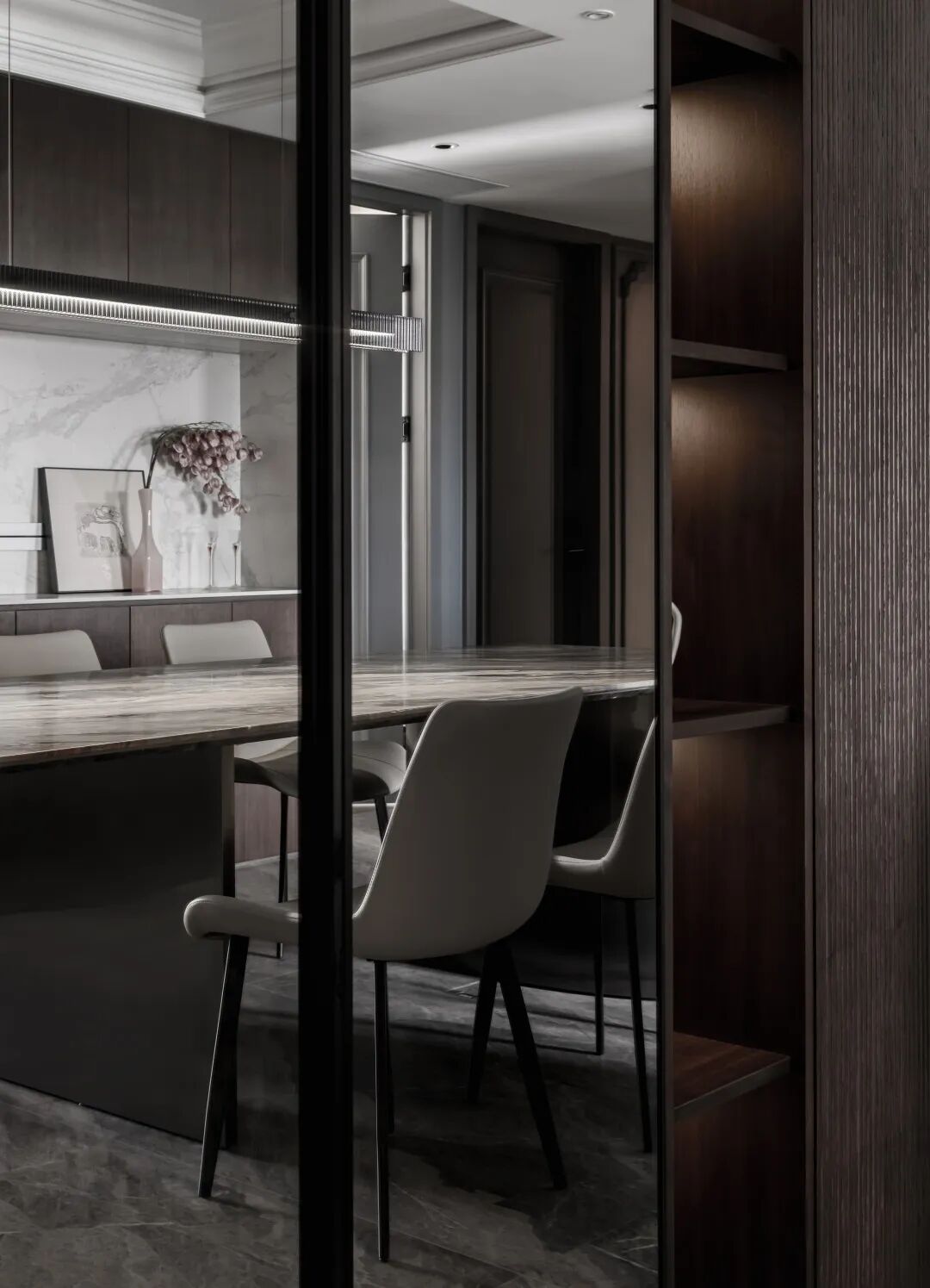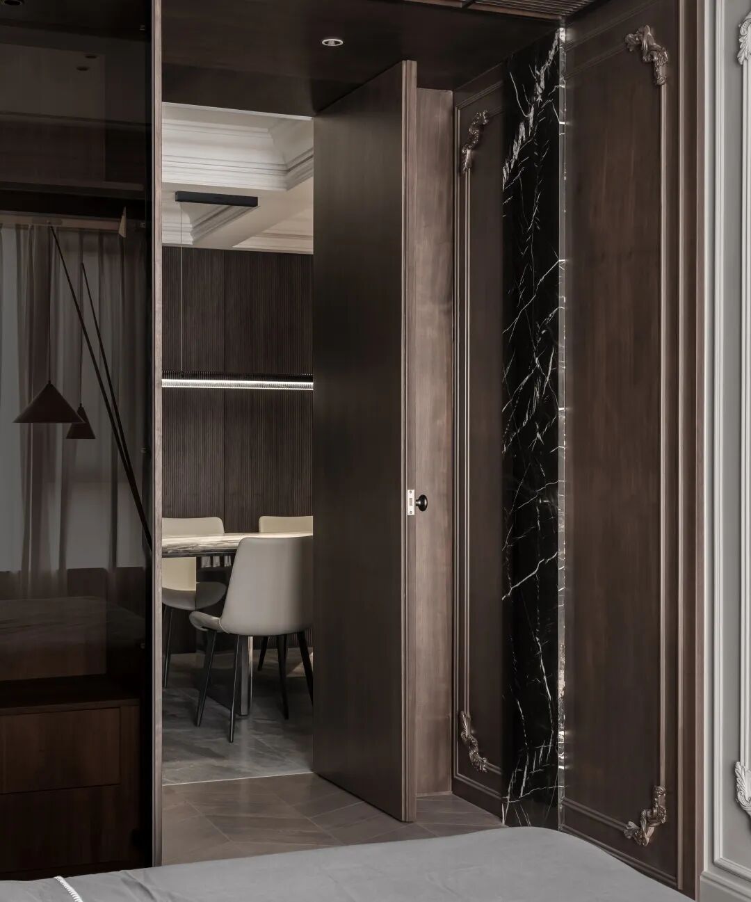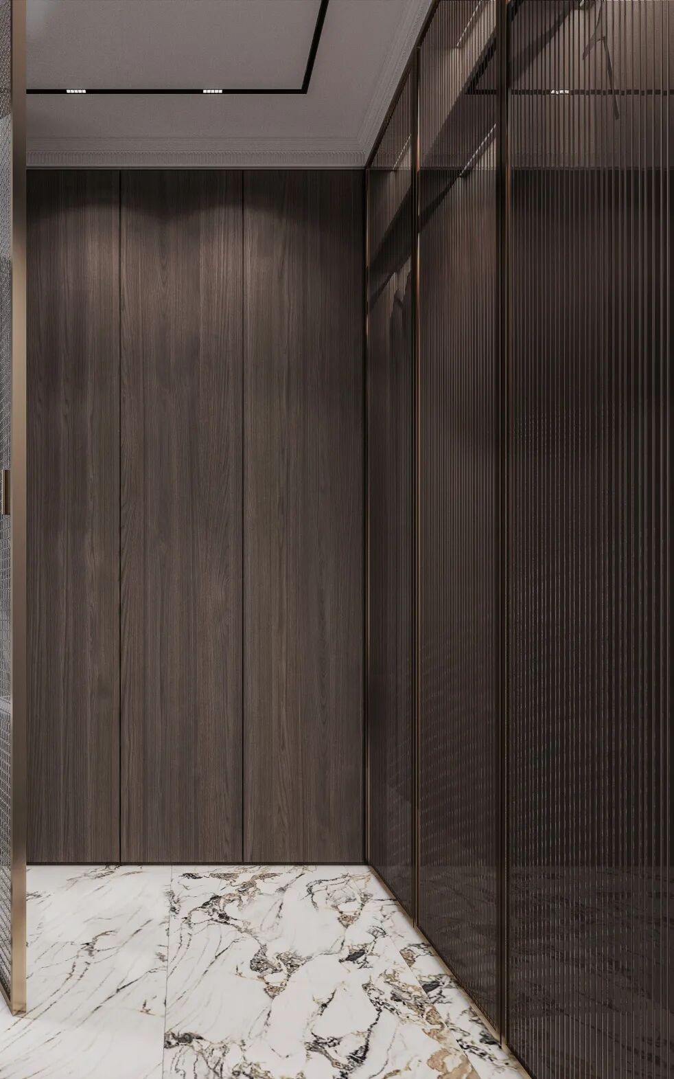 步入式衣帽间采用了少量的木质平板及大理石,使空间层次感更强一些,时尚又精致。