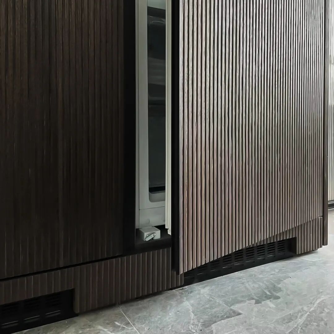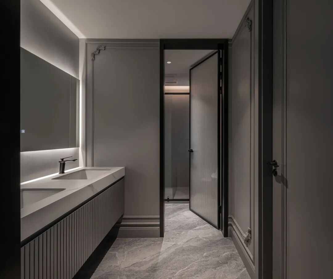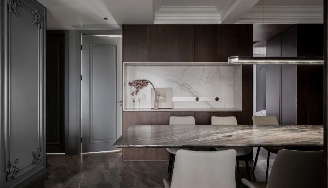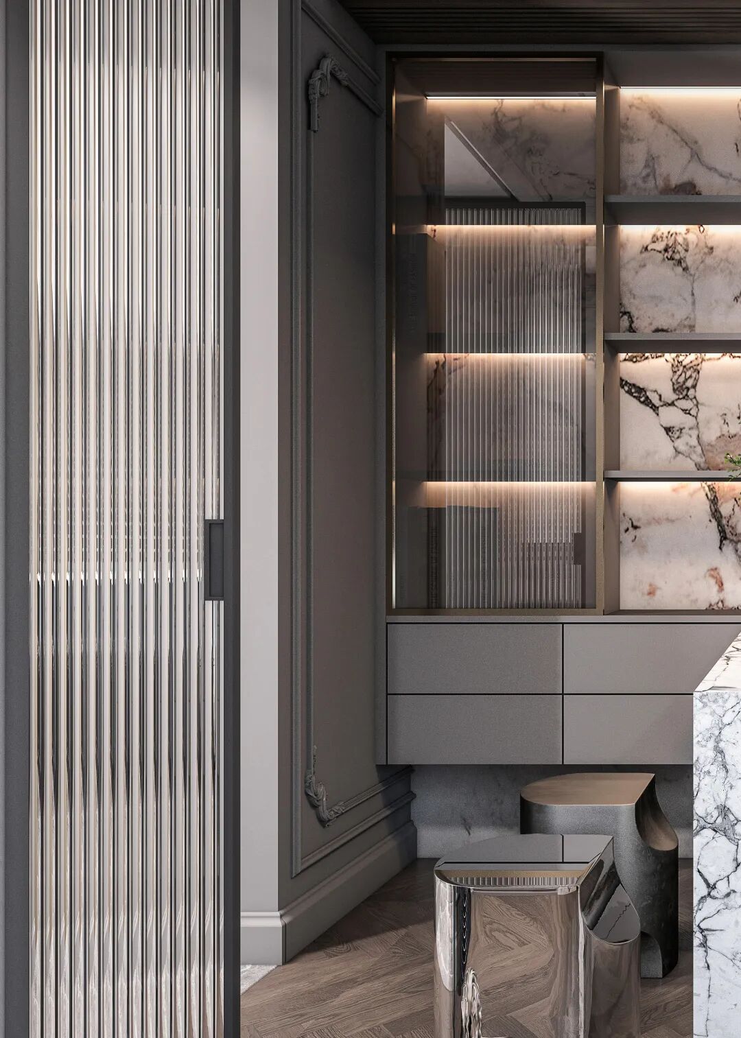 步入式衣帽间采用了少量的木质平板及大理石,使空间层次感更强一些,时尚又精致。