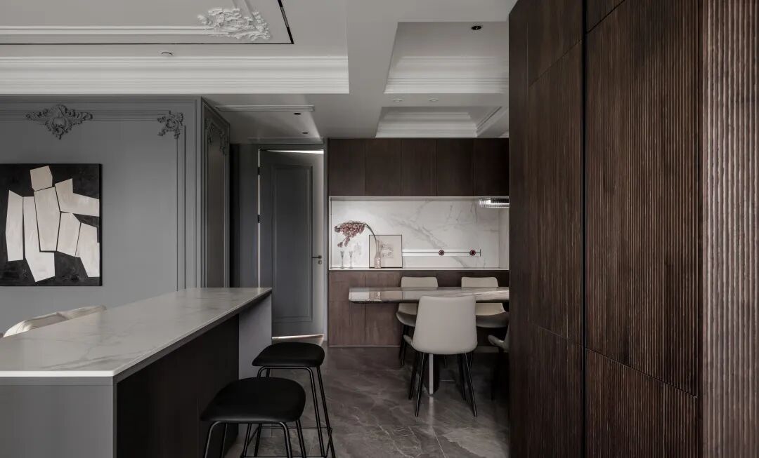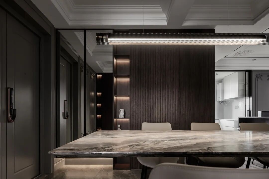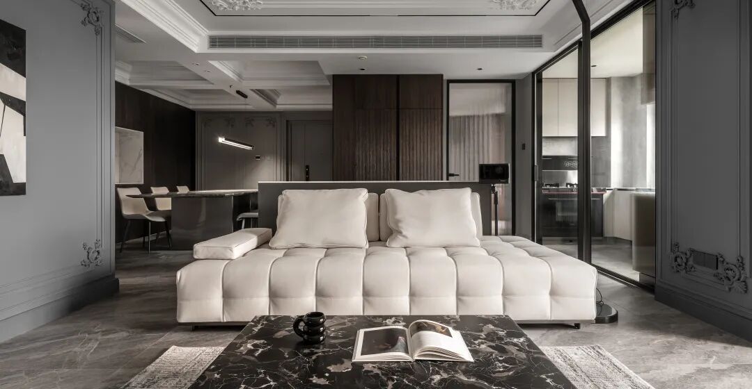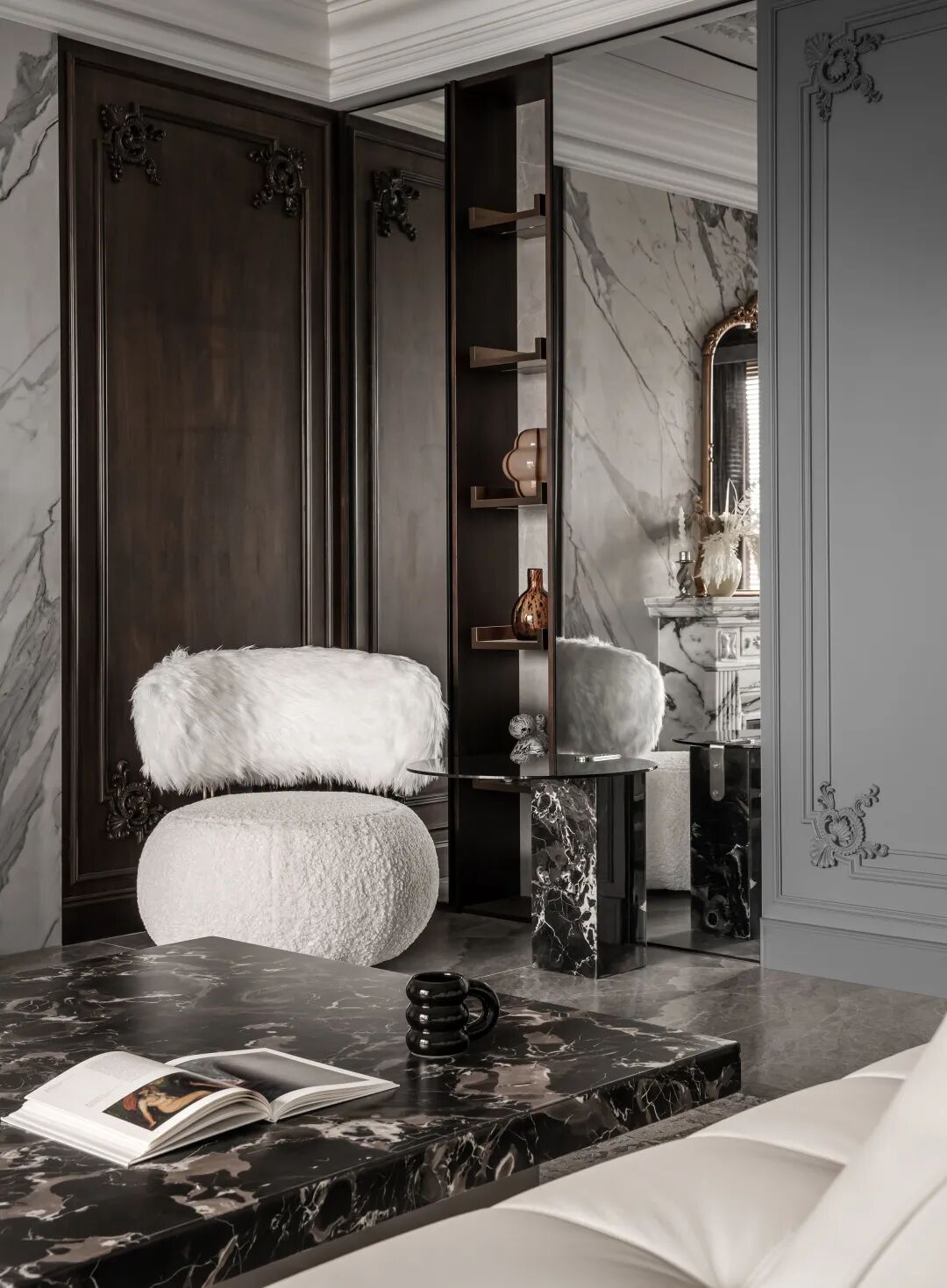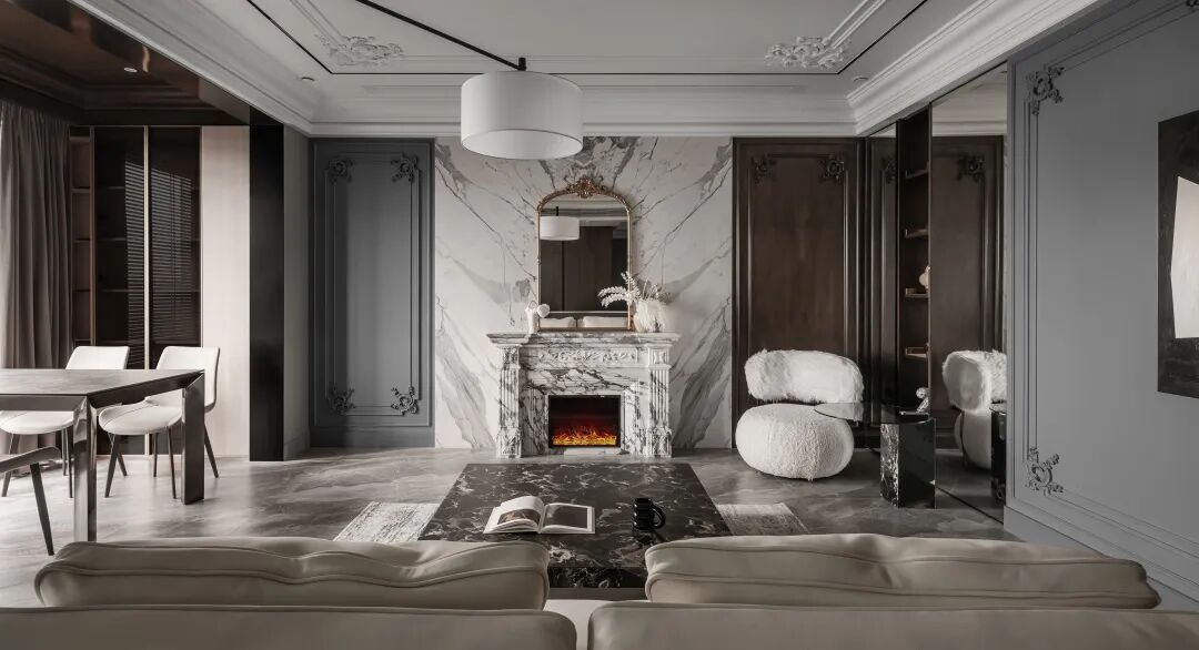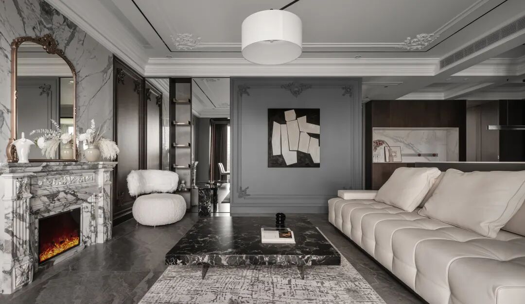 本案减少了法式的柔美线条感,用现代硬朗的结构手法替代造出现有的搭空间。高端的白色大理石背景及壁炉,在客厅中十分优雅显眼。
