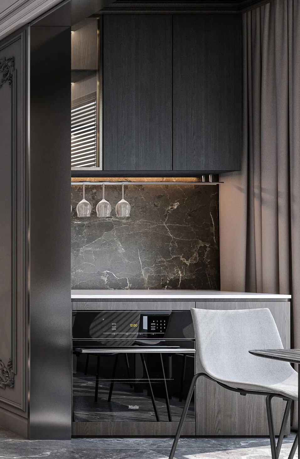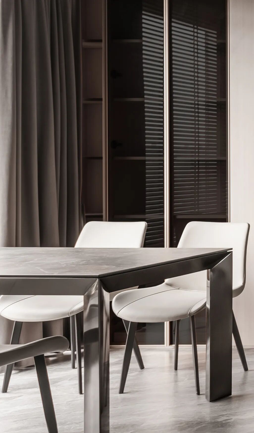 空间结构上通过镜子的破口运用,使侧边的空间瞬间灵魂有趣起来,视觉空间显得通透灵动。黑色大理石茶几,沉稳低调,给空间增添了一份沉静感。