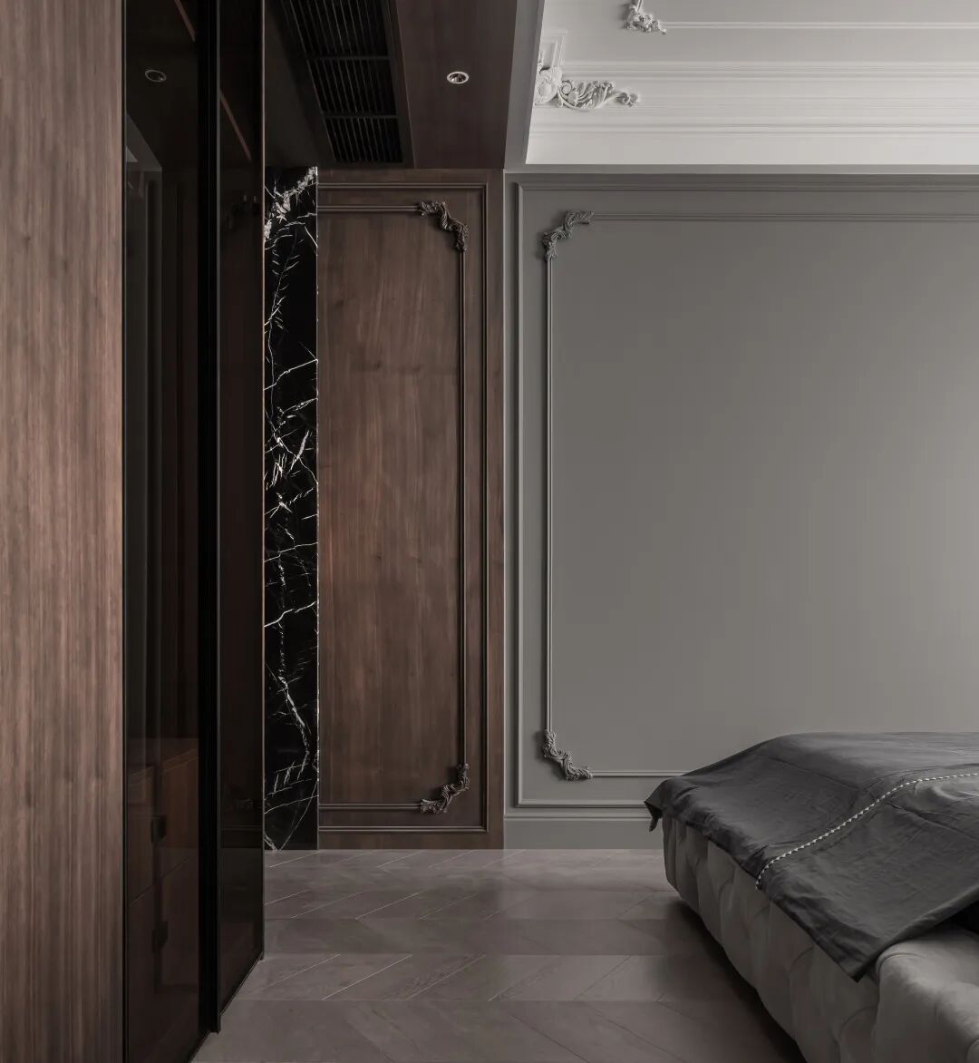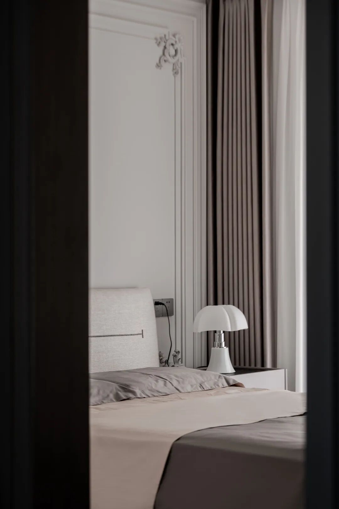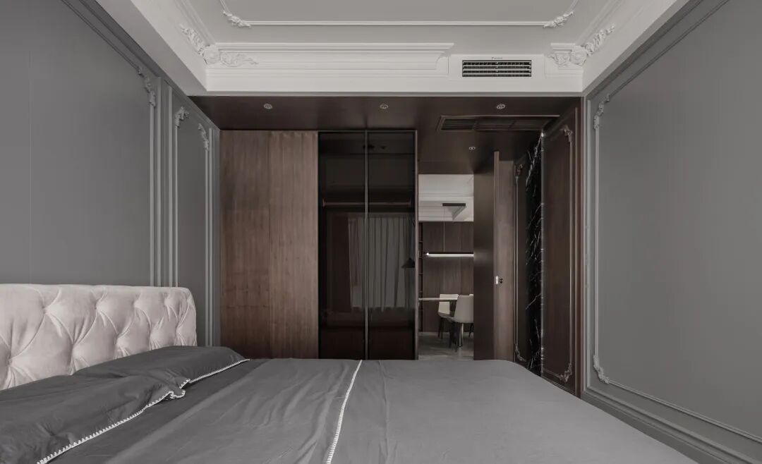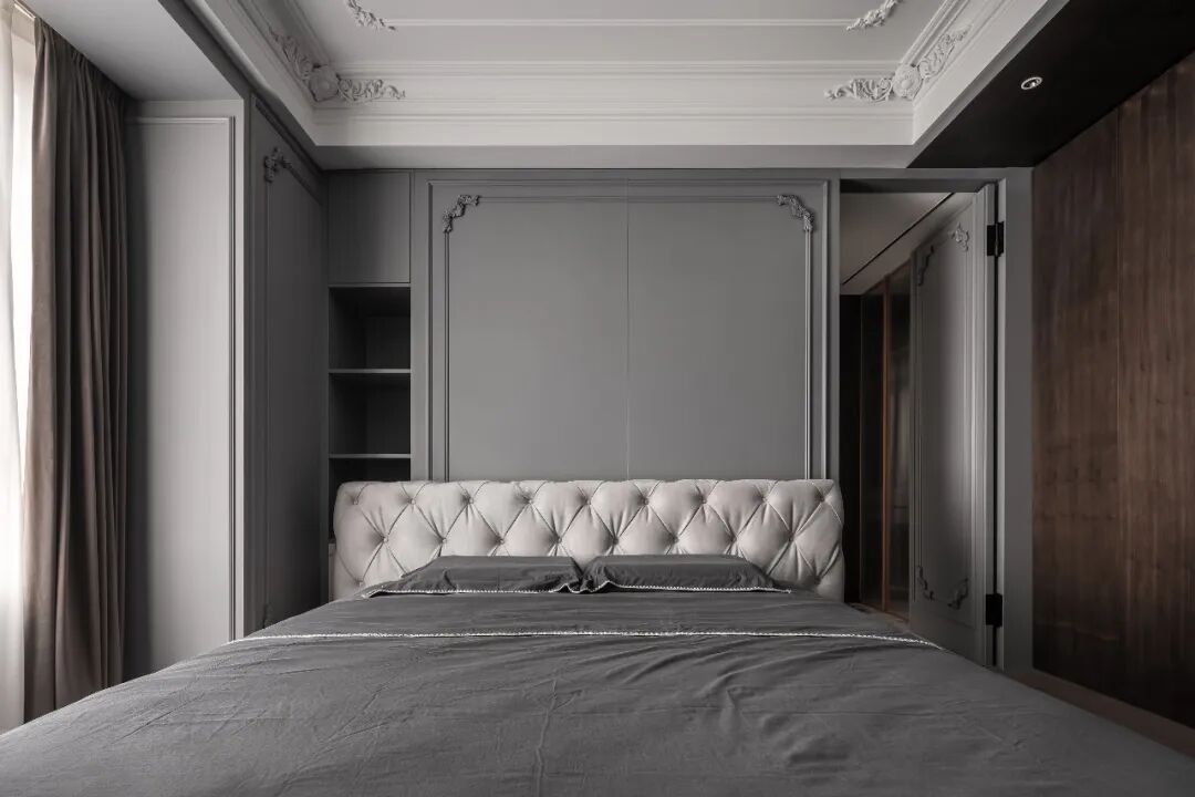 主卧床头背景融合柜子的设计 ,既是装饰的一部分,也是实用床头柜体的功能体现,卫生间的门,通过隐形门手法,跟床头背景,形成统一。