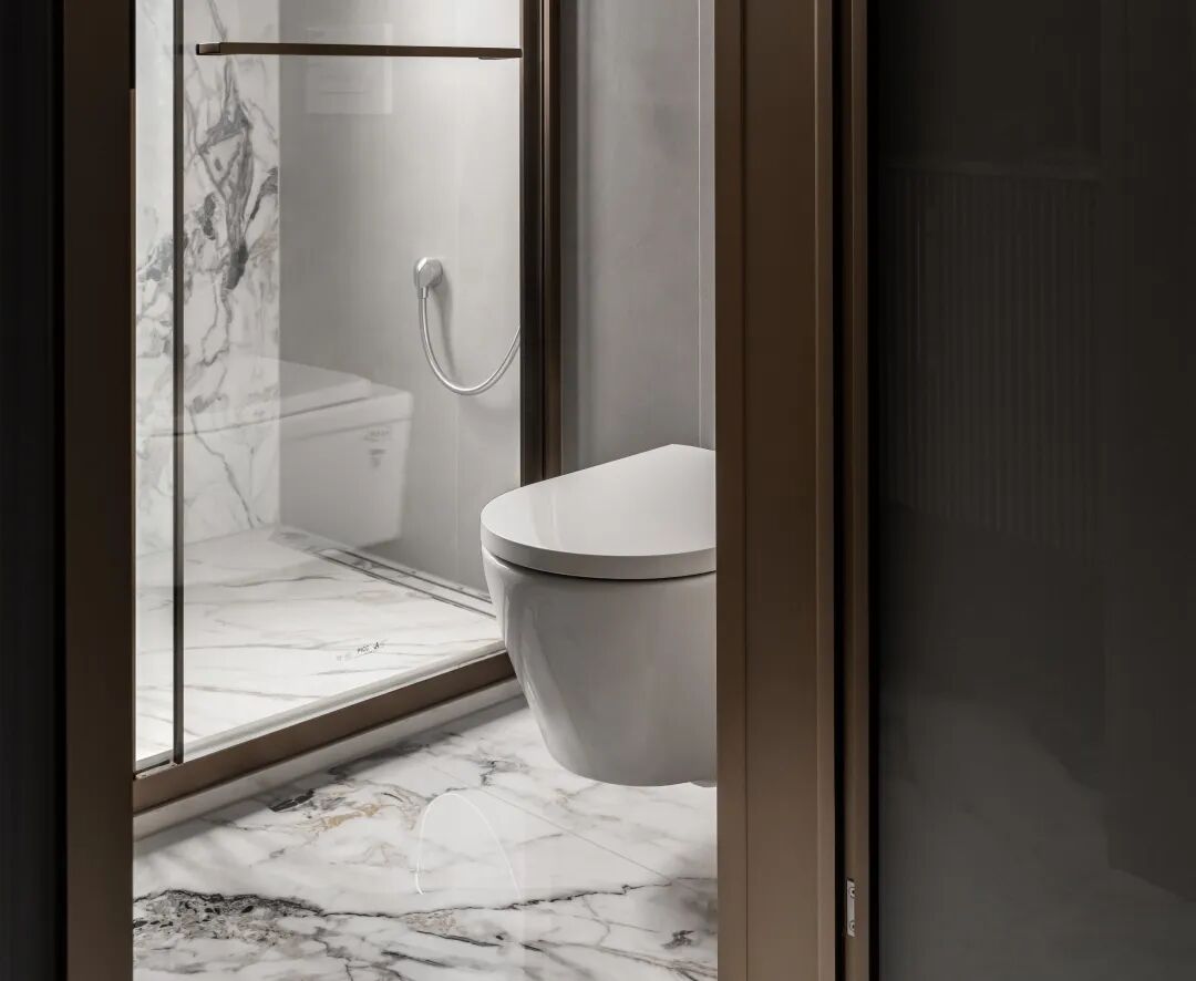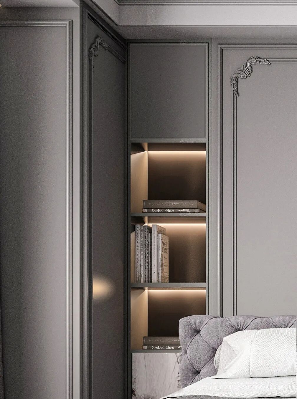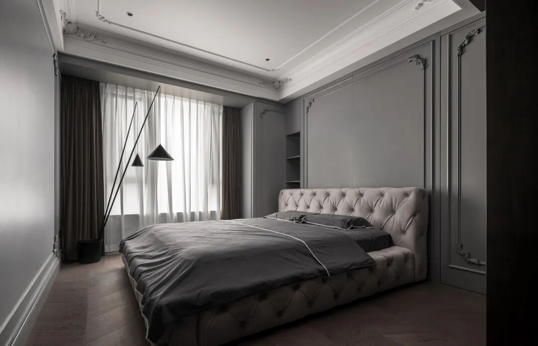 主卧床头背景融合柜子的设计 ,既是装饰的一部分,也是实用床头柜体的功能体现,卫生间的门,通过隐形门手法,跟床头背景,形成统一。